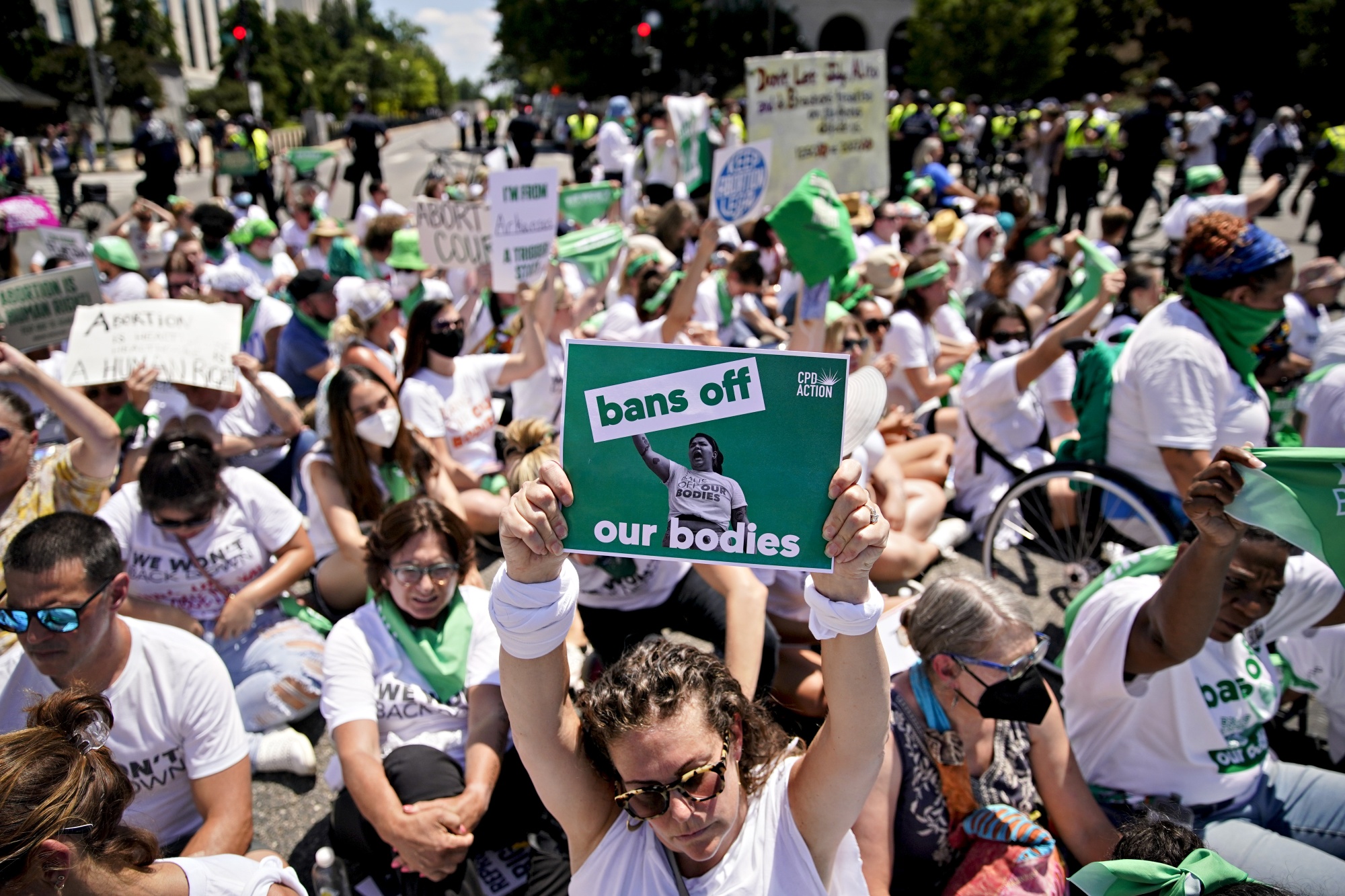 堕胎权利示威者在华盛顿特区美国最高法院附近的抗议活动中坐在路上阻塞了一个十字路口,时间是2022年6月30日星期四。