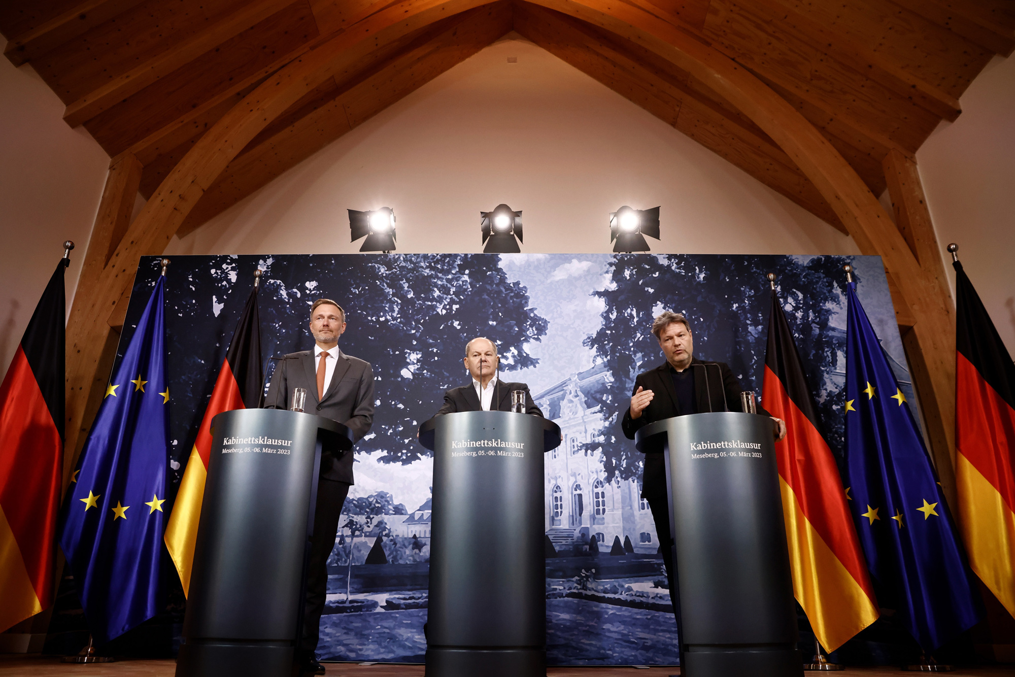 克里斯蒂安·林德纳(Christian Lindner)(左)、奥拉夫·肖尔茨(Olaf Scholz)(中)和罗伯特·哈贝克(Robert Habeck)于3月6日。