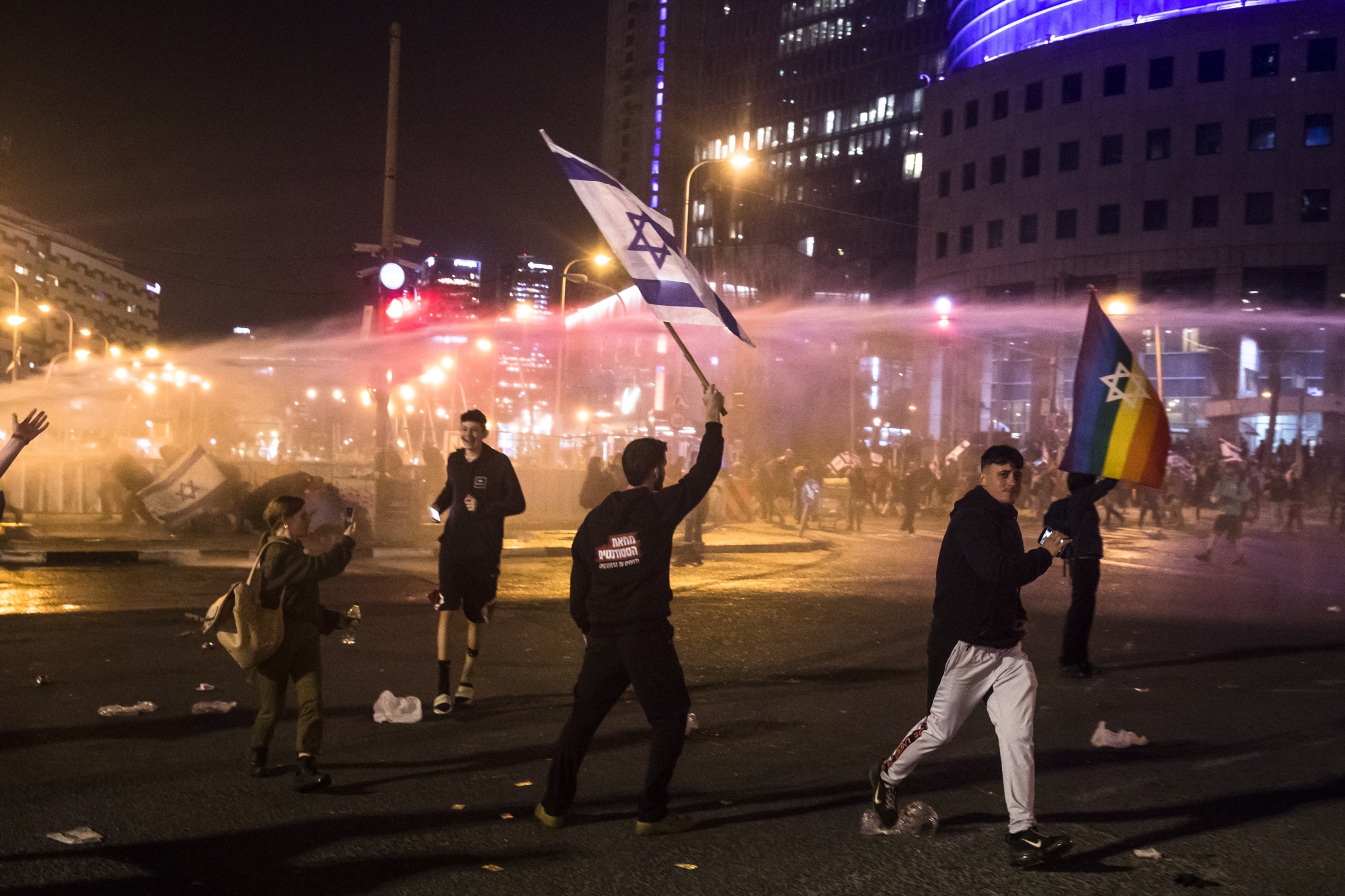 抗议者在特拉维夫与使用水炮的警察发生冲突。摄影师:Amir Levy/Getty Images内塔尼亚胡在与其联盟中的一个关键右翼成员伊塔马尔·本吉尔达成协议后发表讲话,本吉尔最初威胁要离开政府,如果司法改革被推迟。作为接受暂停的协议的一部分,本吉尔将被授予对他认为需要增加安全的新国民警卫队的监督权。