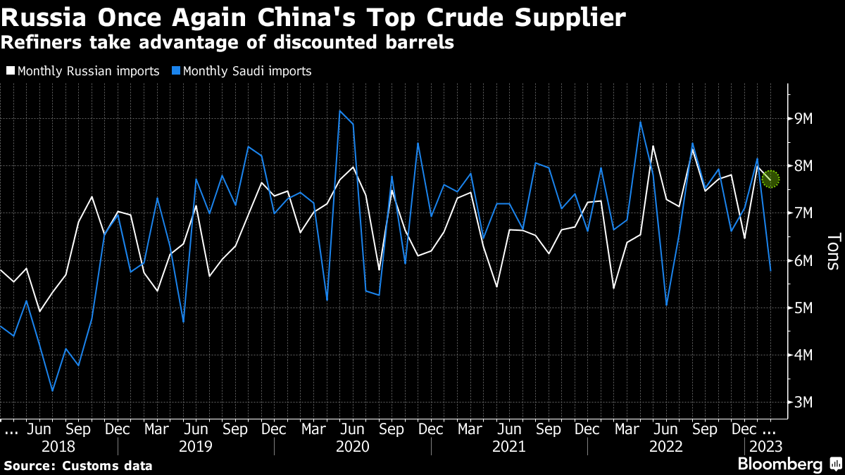 中国上个月从俄罗斯进口了769万吨原油,相当于每天200万桶,根据该国的海关数据。沙特阿拉伯的原油供应量下降到了自六月以来的最低水平,比一月份下降了29%。