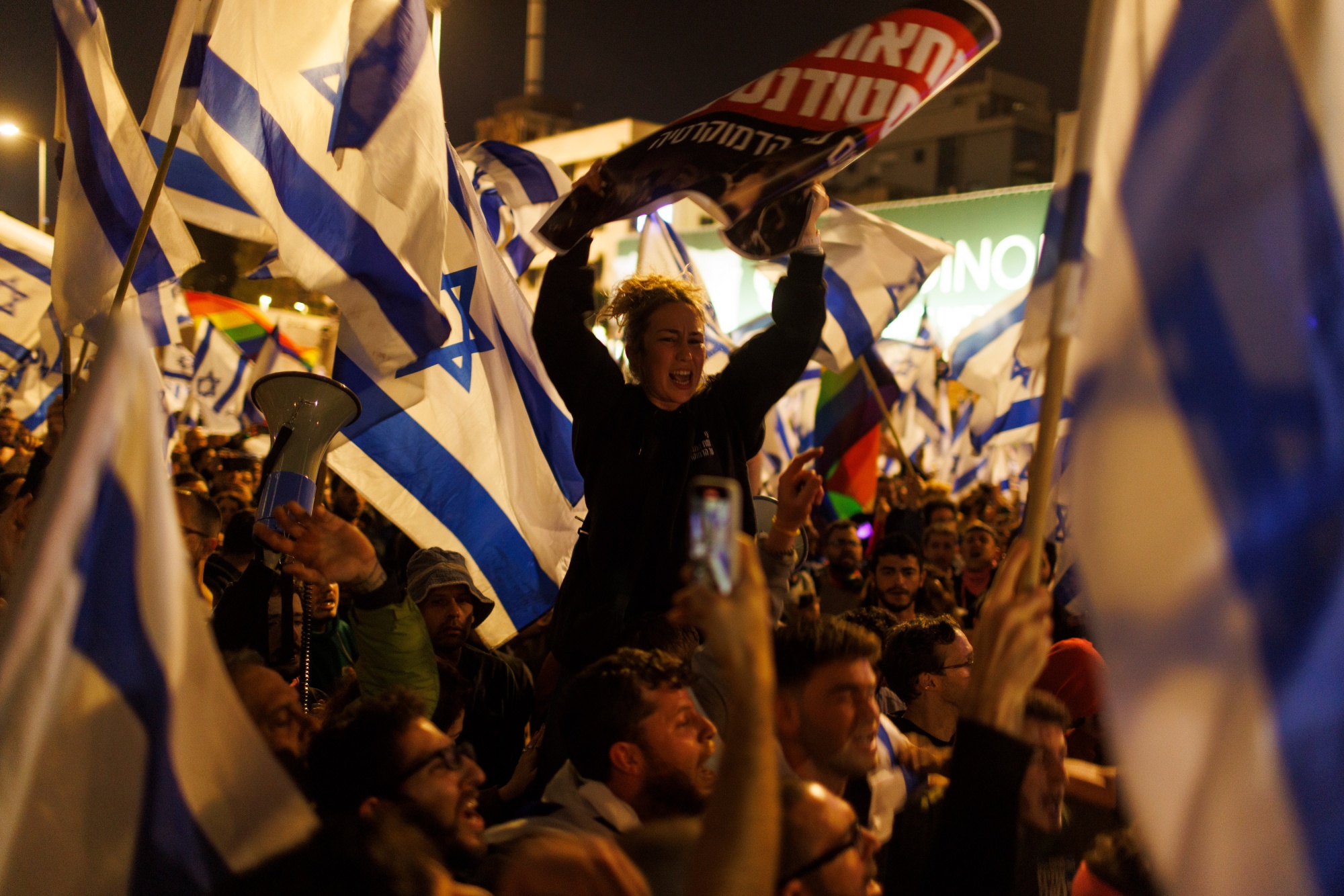 夜间,街道一片火光,内塔尼亚胡解雇了他的国防部长约夫·加兰特,因为后者在未经授权的电视讲话中呼吁出于国家安全考虑延迟。