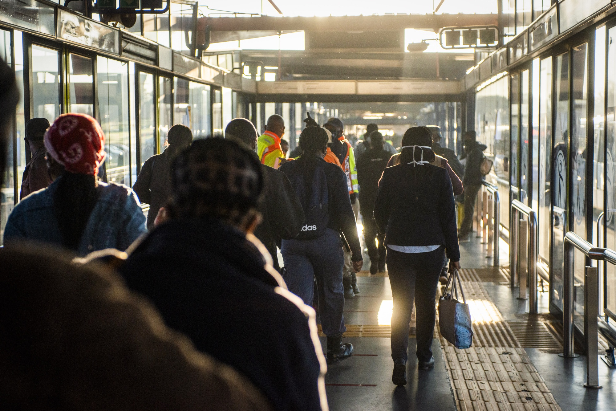 通勤者穿过约翰内斯堡索韦托区的一个公交车站。