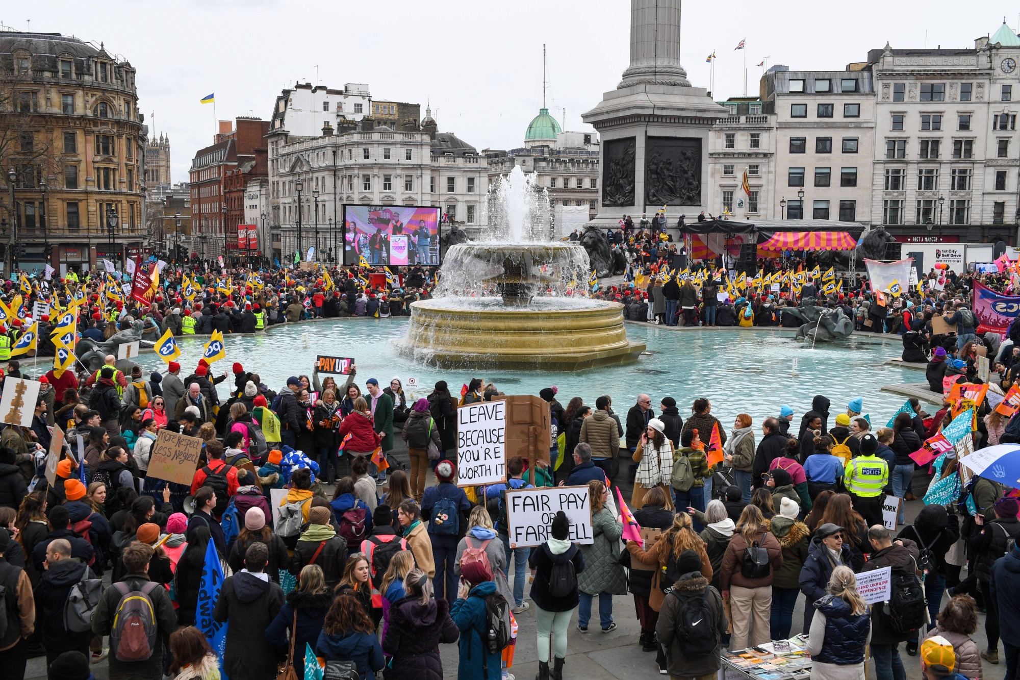 罢工的初级医生、公务员和教师参加了在伦敦特拉法加广场举行的集会。