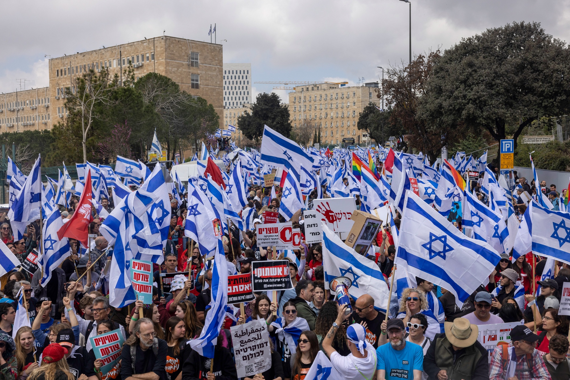 示威者在以色列耶路撒冷抗议总理本雅明·内塔尼亚胡的联合政府和拟议的司法改革,日期为3月27日。摄影师:科比·沃尔夫/彭博社迪斯金表示,内塔尼亚胡成功推迟而没有导致政府垮台表明他的一些能力仍然存在,他曾认为暂停“将意味着政治自杀”,因为一些盟友对该计划深感承诺。