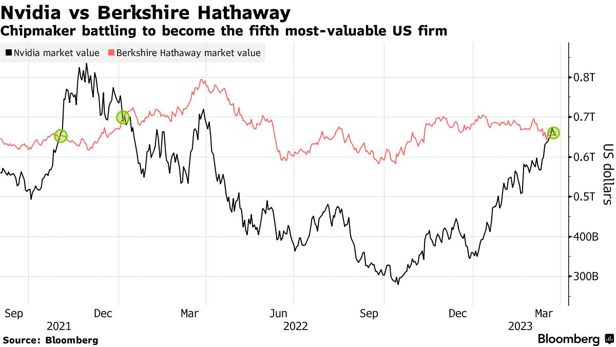 英伟达公司今年股价上涨了82%,市值增加了近3000亿美元。 这一增值使这家芯片制造商进入了由美国市值前五大公司组成的精英集团。 截至周一收盘,英伟达的市值为6550亿美元,距离第五名的伯克希尔哈撒韦公司6620亿美元并不遥远。