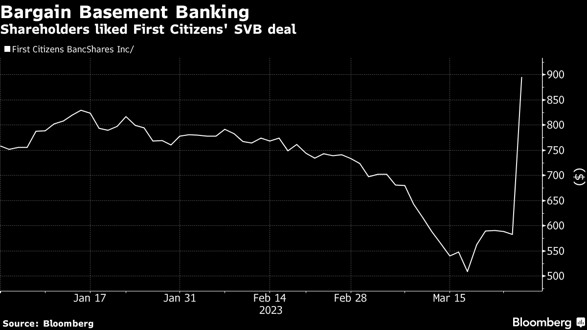 更好的是,美国当局终于设法摆脱了引发这场混乱的银行 — SVB。First Citizens BancShares Inc.收购了这家银行(尽管Matthew Monks指出,使用“收购”这个词在那句话中是复杂的)。First Citizens是否做了一笔好买卖?下面的股价图表表明是这样的。