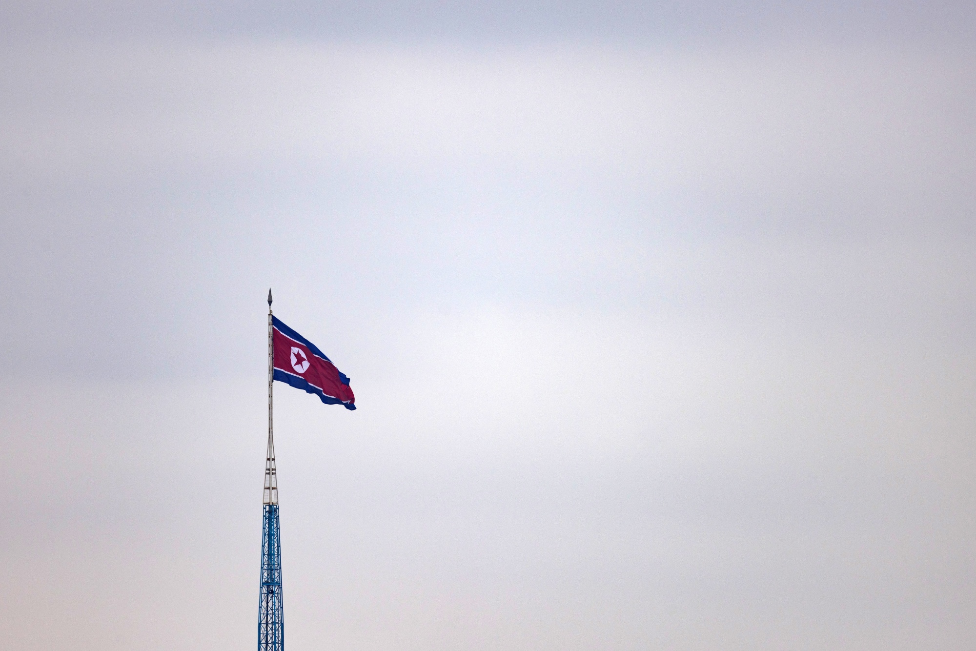 一面朝鲜国旗飘扬在朝鲜的基井洞村上空,从韩国坡州的板门店非军事区(DMZ)朝鲜。