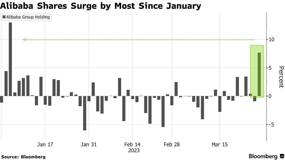 阿里巴巴集团控股有限公司的美国股票在中国在线商业领导者宣布将其价值2200亿美元的帝国分拆为六个业务单元的计划后上涨了14.3%,这是一项重大重组,承诺将产生几个首次公开募股。