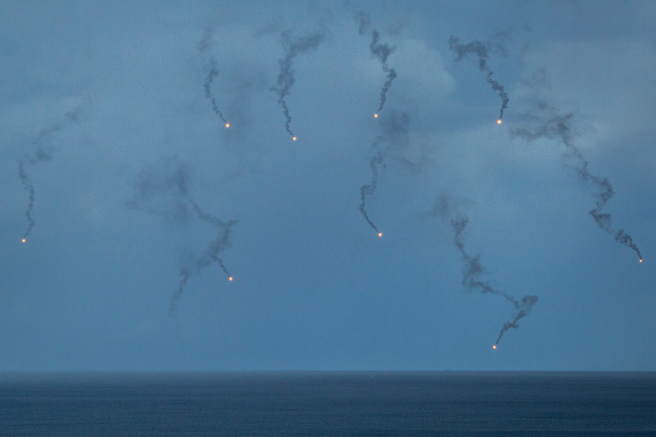 炮兵照明弹在2022年8月9日台湾实弹演习期间发射到天空中。