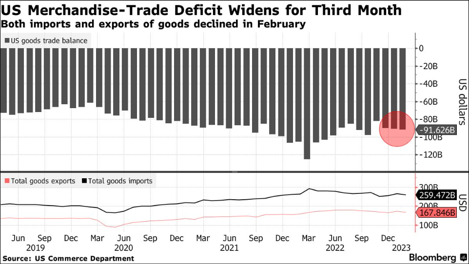 出口下降 | 2月份,美国商品贸易逆差连续第三个月扩大,因出口价值下降超过进口下降。商务部周二公布的数据显示,商品贸易逆差增长了0.6%,达到916亿美元,为自10月以来最宽。这一数字未经通胀调整,与彭博调查中经济学家对90亿美元逆差的中位数估计相比。