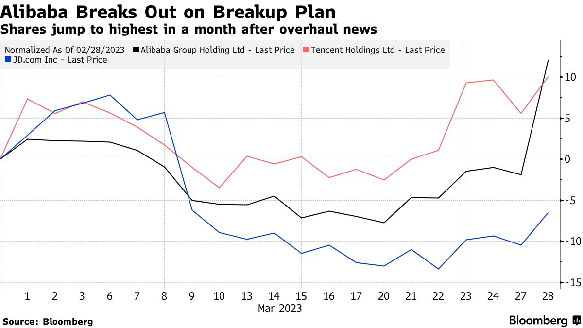 其股价在香港飙升超过16%,略高于在纽约的涨幅,为其市值增加了超过300亿美元。包括腾讯控股有限公司在内的竞争对手也大涨,预计阿里巴巴的同行可能会在宽松的监管环境中探索类似的行动。
