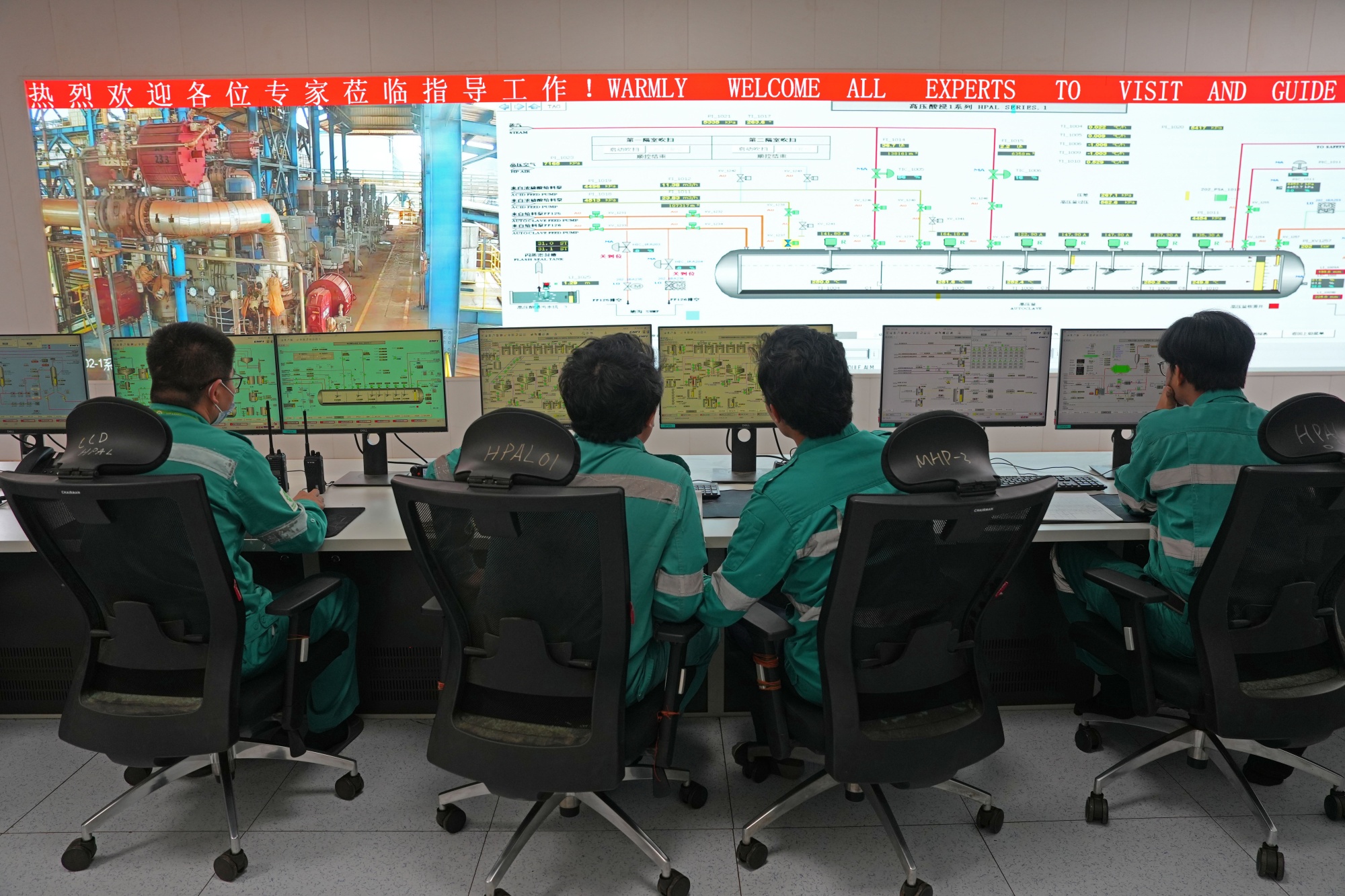 在哈里塔的HPAL设施控制室内,展示镍加工的各个阶段。摄影师:Dimas Ardian/Bloomberg两年前,在离雅加达两次航班和三小时渡轮车程的Obi,工人们沿着一条红土路推动了一个近1000吨的压力锅状机器。