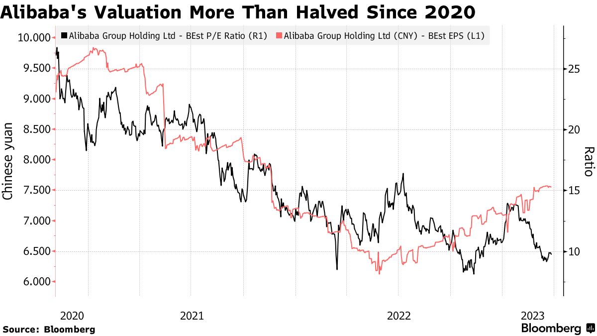 阿里巴巴的前瞻性盈利倍率使其股票比公用事业公司中电控股有更便宜的价格,并且与中国电信股份有限公司持平。