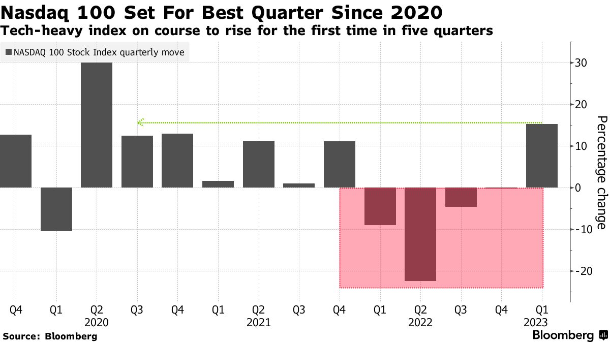 纳斯达克100指数周三上涨了1.3%,使这个以科技股为主的指数有望结束两天的下跌,并延续本季度以来的涨势。该基准指数自年底以来上涨了17%,为自2020年6月以来的最佳季度,此前连续四个季度下跌。