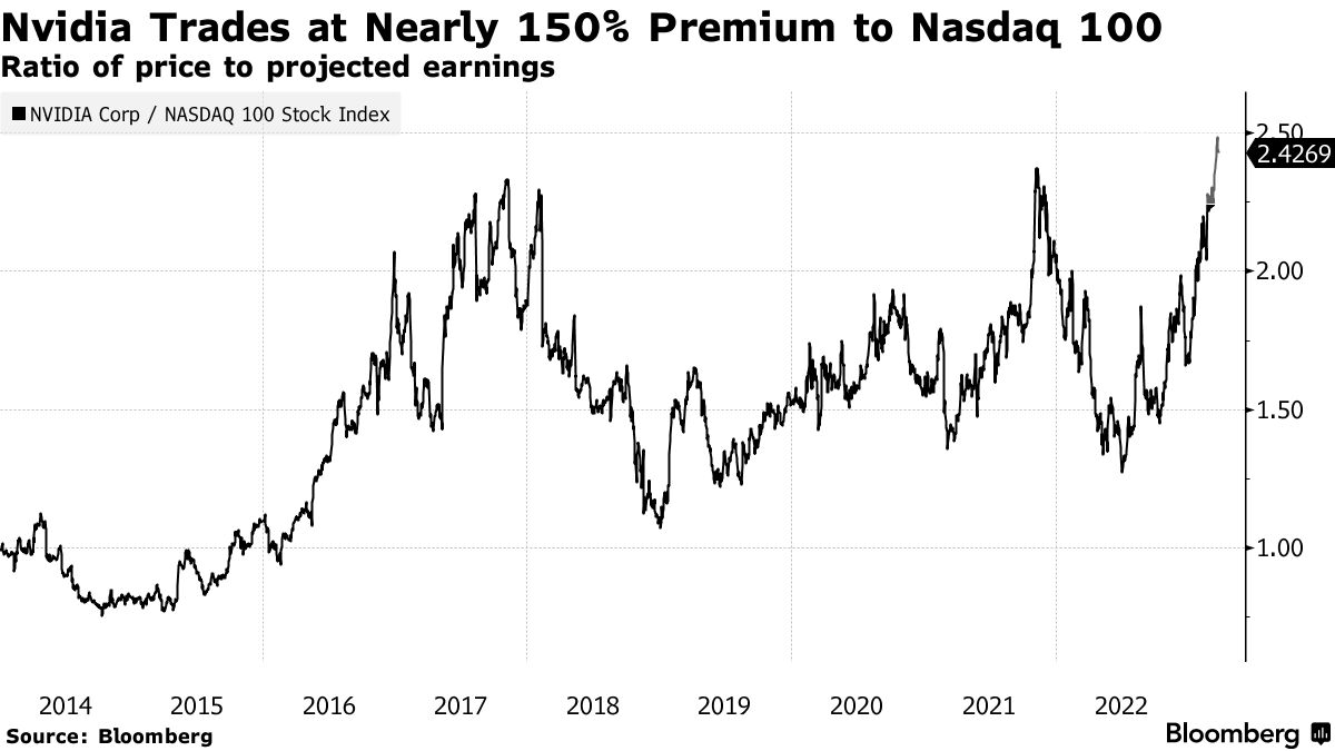 Nvidia 交易时的预计收益为 56 倍,几乎是费城证券交易所半导体指数的 21 倍的三倍,也比纳斯达克 100 高出近 150%,根据彭博编制的数据。 Nvidia 过去十年的平均倍数为 30 倍。