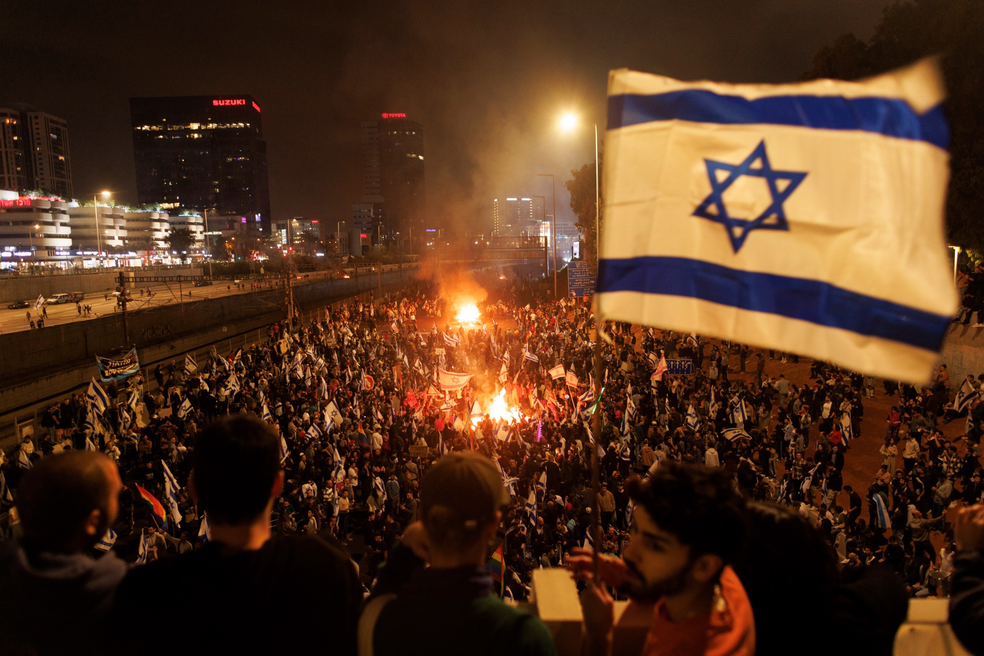 示威者在特拉维夫封锁了艾亚隆高速公路,抗议总理本雅明·内塔尼亚胡的联合政府和拟议的司法改革,时间是3月26日。