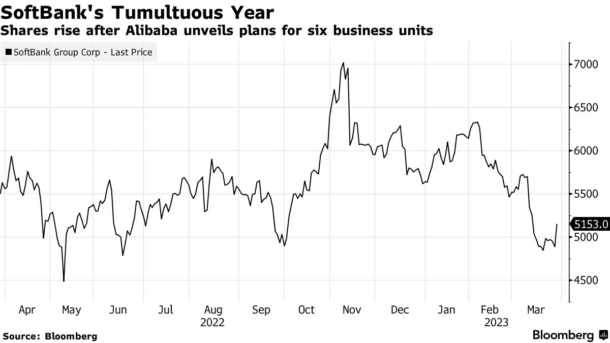 “全球银行体系一直存在焦虑,但这种焦虑已经开始减弱。现在我们有了这个阿里巴巴的消息,这显然对软银是一个利好,”信金资产管理首席基金经理藤原直树表示。“预期是拆分单位将得到适当的业务估值,这将提升阿里巴巴的整体企业价值。”