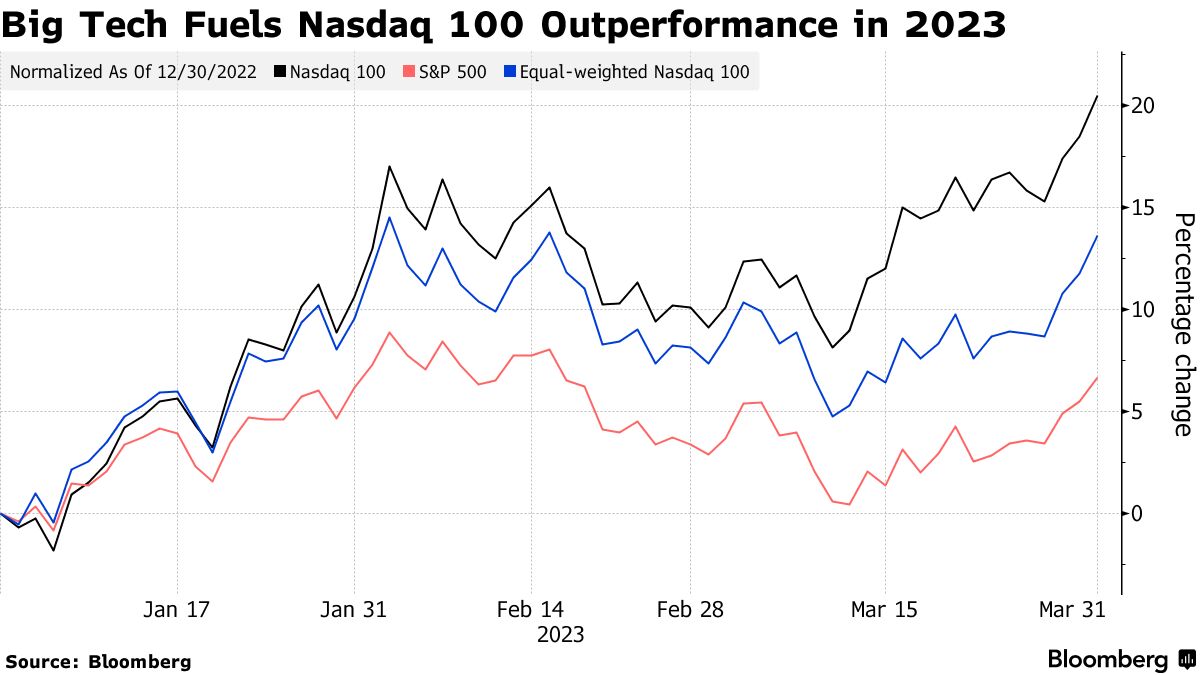 纳斯达克100指数本季度上涨了20.5%,是自2020年中期以来的最大季度涨幅。指数涨幅主要集中在最大的科技和互联网股票中,指数的等权版本涨幅不到14%。与此同时,更多暴露于金融行业的标普500指数本季度上涨了7%。