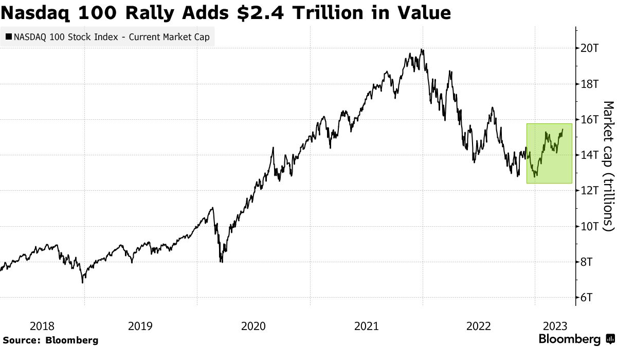 纳斯达克100指数今年以来的涨幅为该指数的市值增加了超过2.4万亿美元。这使得该指数的价值达到约15.5万亿美元,而2021年底曾接近20万亿美元的峰值相比有所下降。