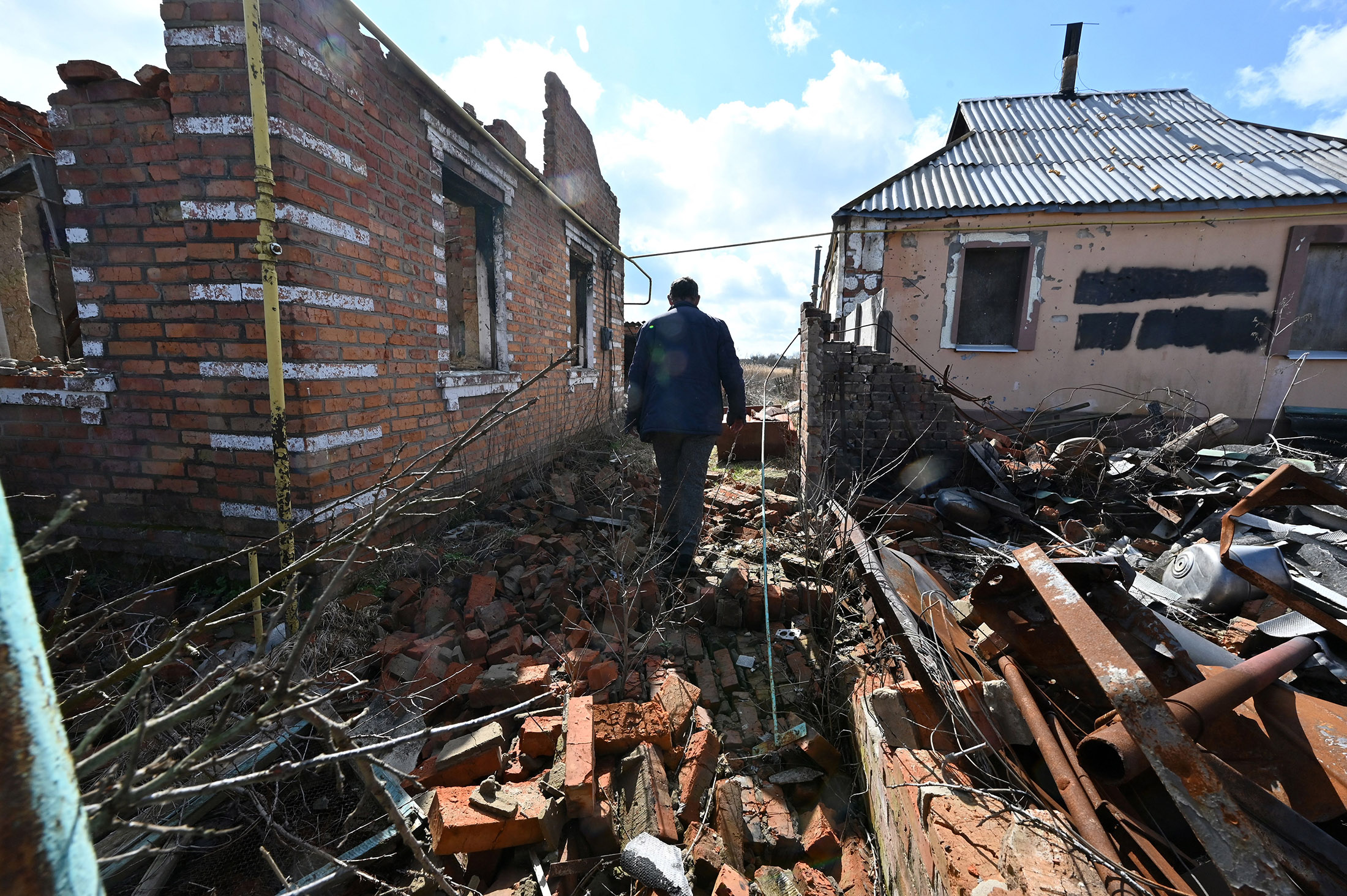 一位居民在乌克兰哈尔科夫地区北部的Russkiye Tishki村庄被摧毁的房屋旁边走过,时间是3月27日。