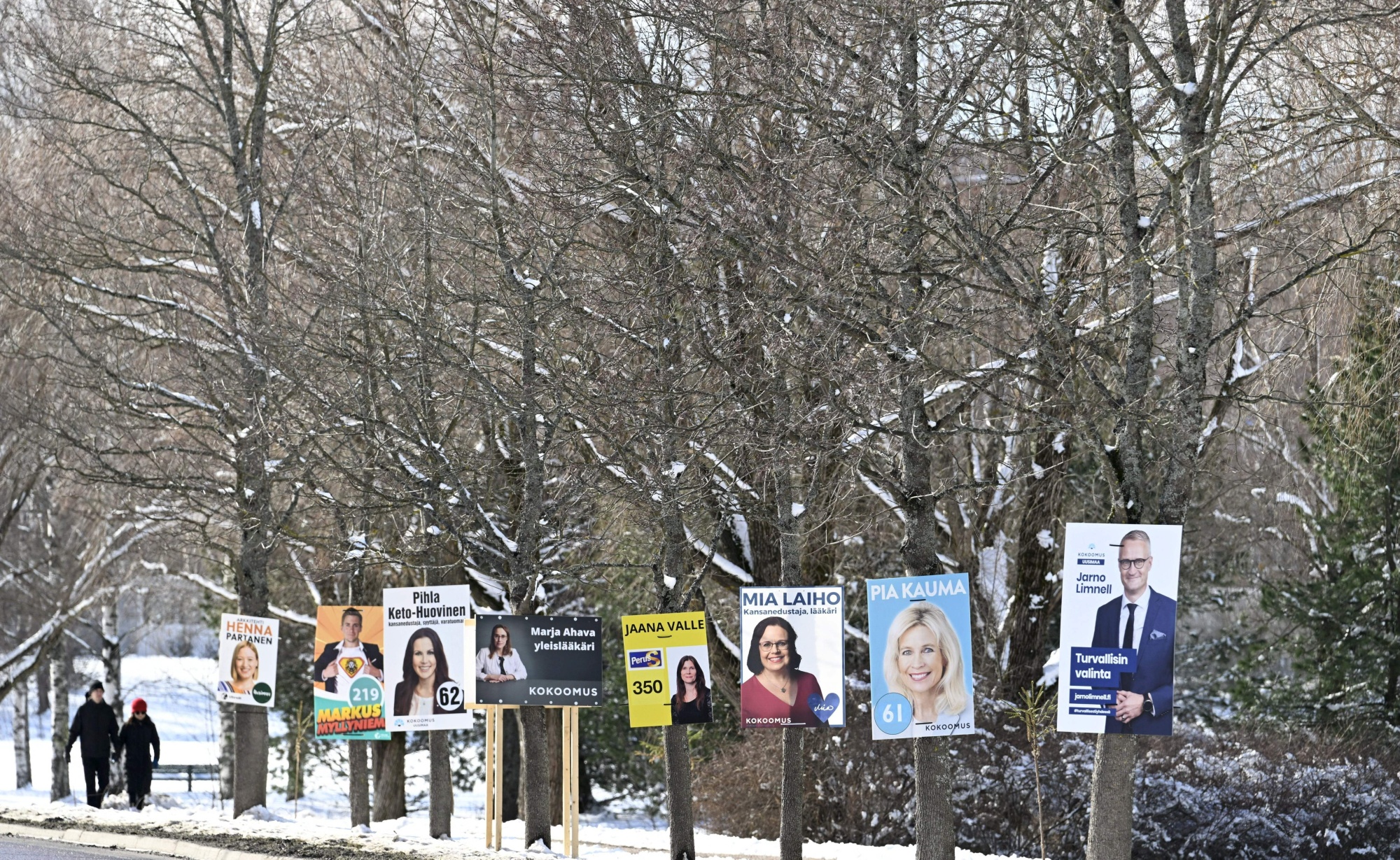 芬兰埃斯波一条路边的选举海报,拍摄于3月29日。