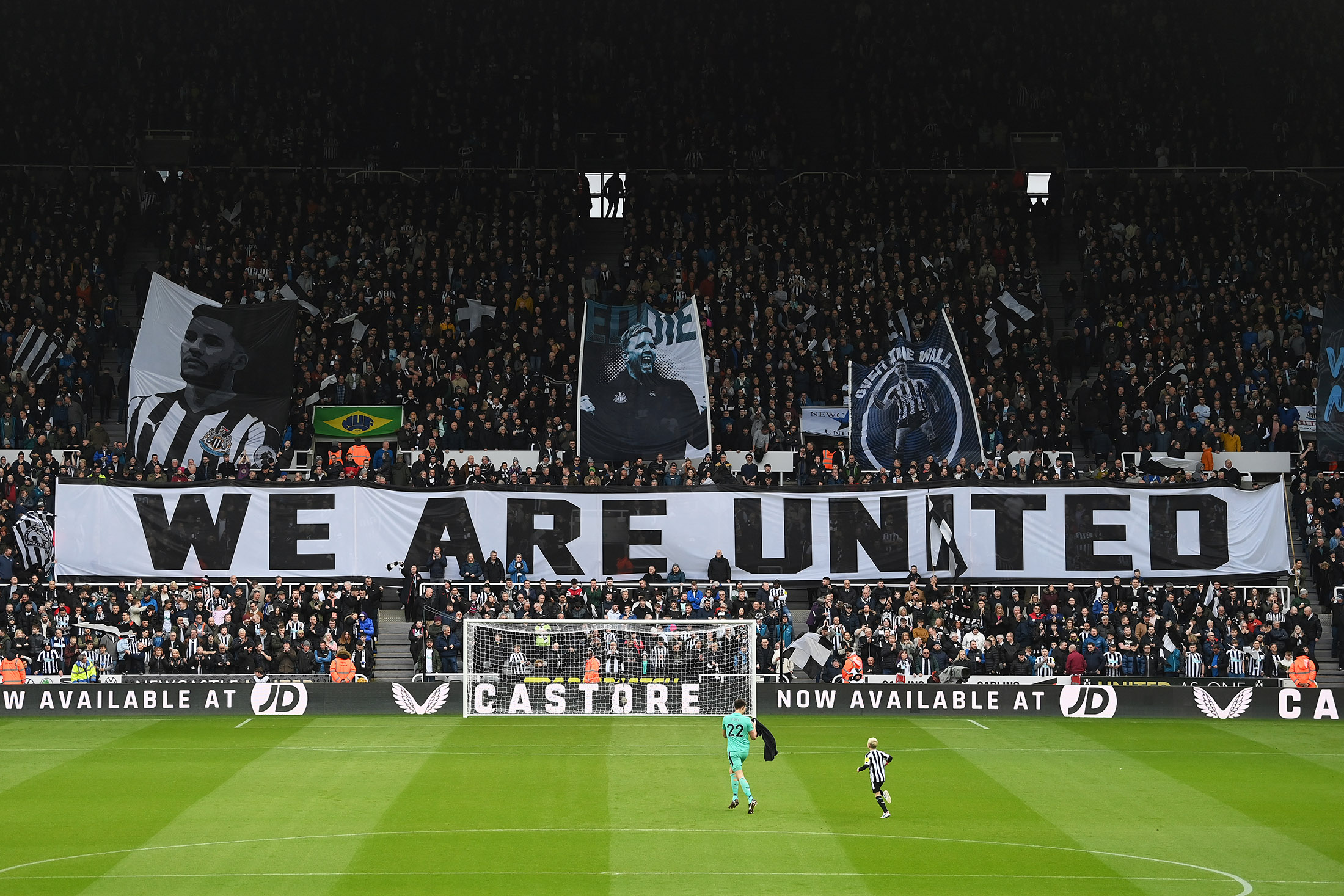 球迷们在英格兰纽卡斯尔泰恩的圣詹姆斯公园观看英超联赛前,展示了他们的支持,时间是3月12日。