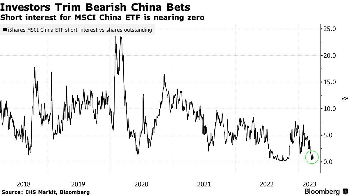 - 美国交易员对中国股票要么更加乐观,要么不再对市场感兴趣。在美国交易的最大中国股票交易所交易基金(ETF)——iShares MSCI China ETF的空头利益接近于零,该基金资产规模达86亿美元。