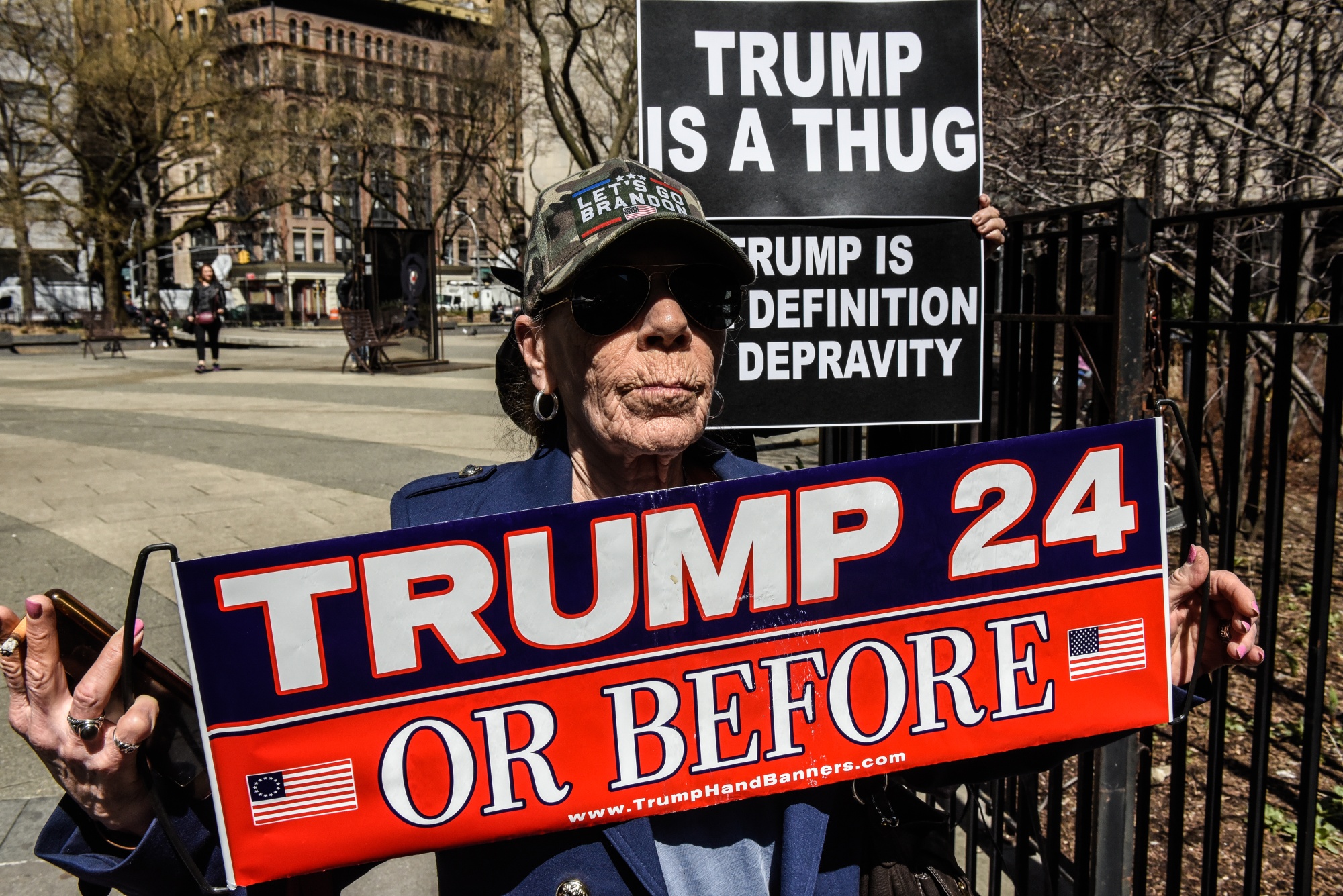 在纽约曼哈顿地区检察官阿尔文·布拉格办公室附近的刑事法院外示威者。