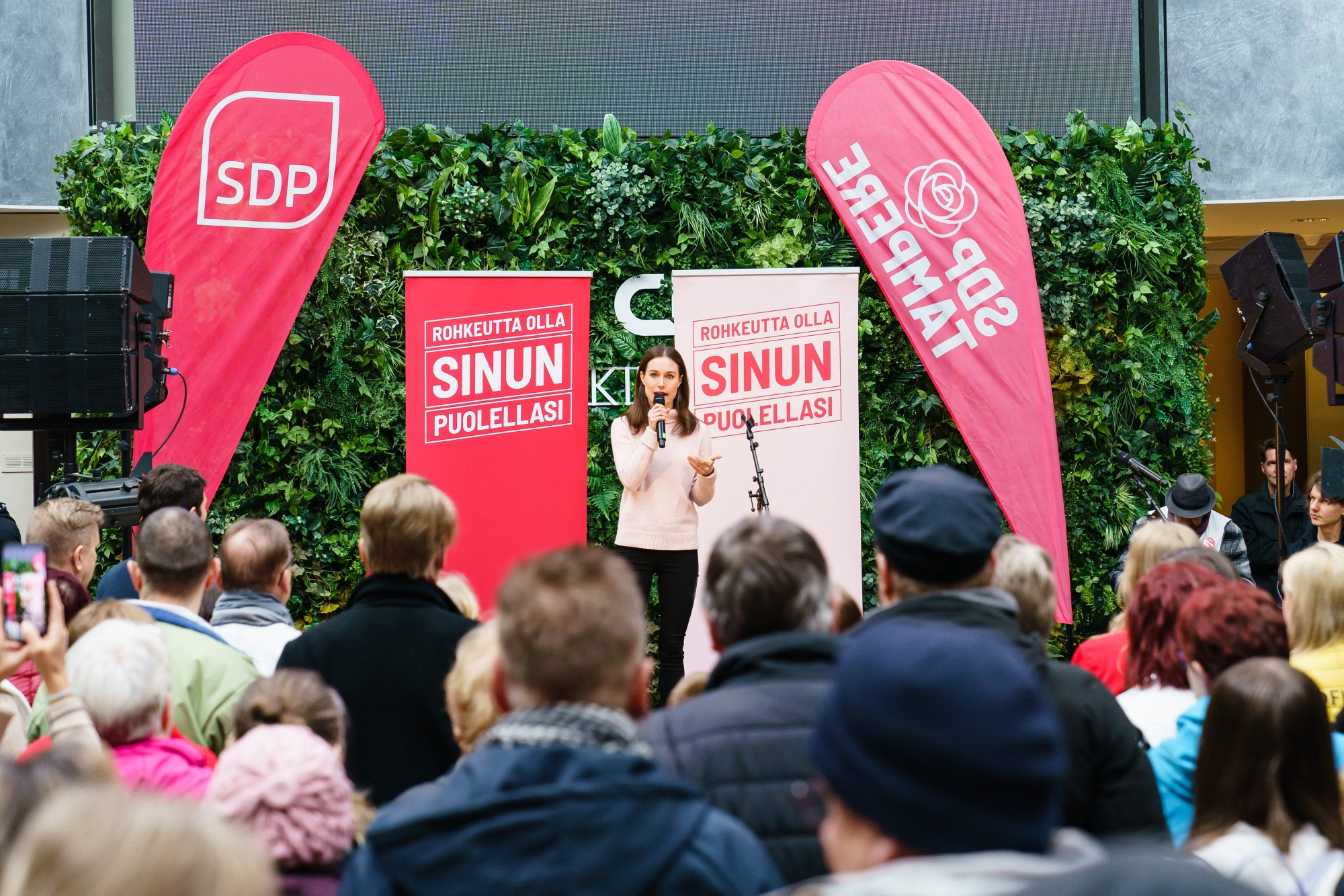 桑娜·马林在芬兰坦佩雷竞选,时间是3月25日。摄影师:米卡·库尔马尼米/莱赫蒂库瓦/法新社/盖蒂图片社### 俄罗斯的战争加剧了欧盟最贫困国家再次投票的混乱(上午6点)