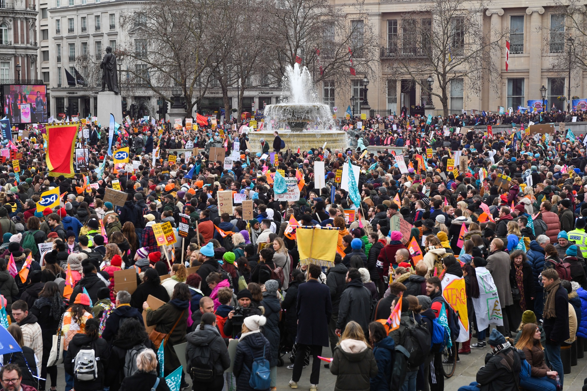 英国伦敦特拉法尔加广场举行罢工的初级医生、公务员和教师于3月15日参加集会。