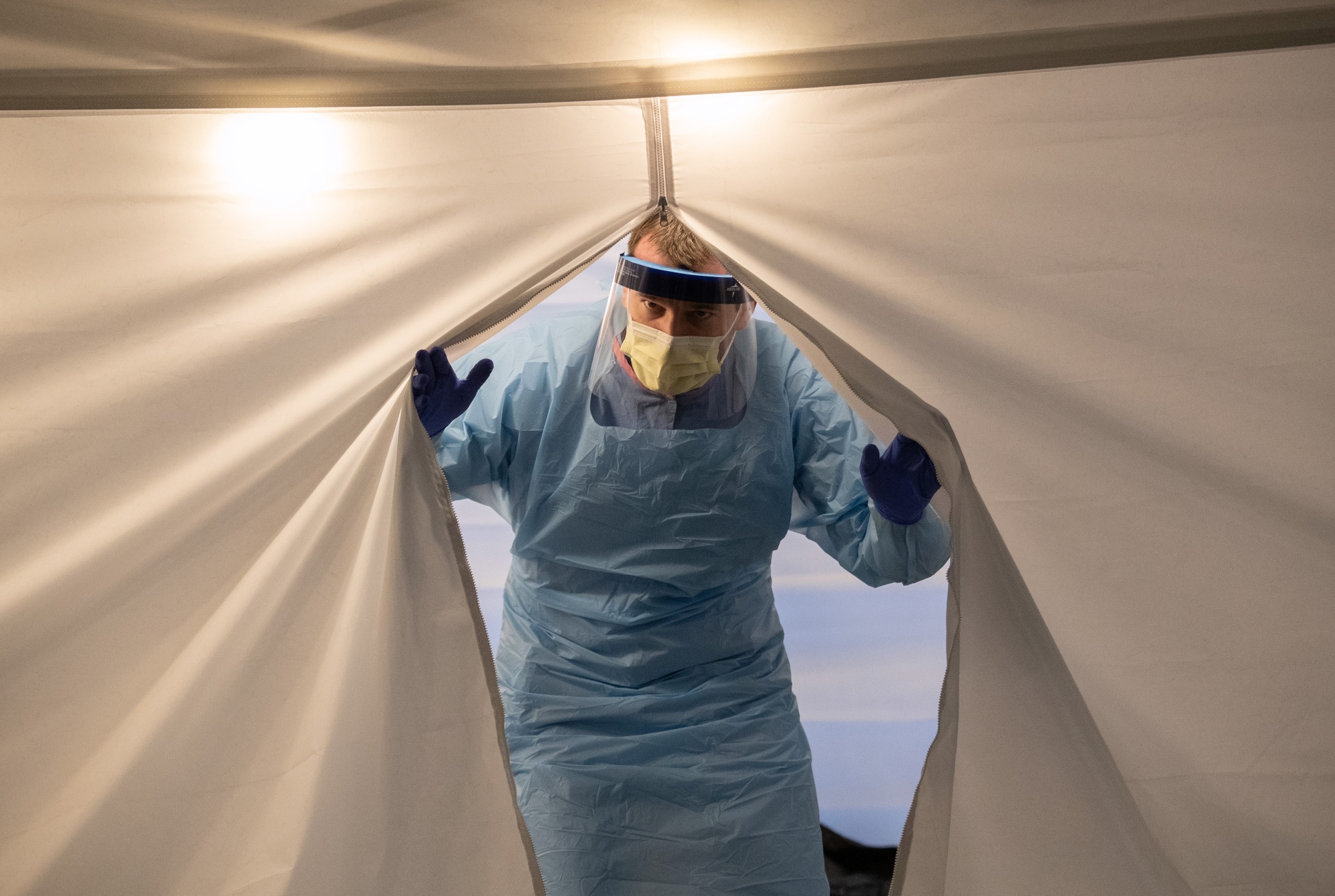 一名护士从2020年3月在华盛顿州西雅图的华盛顿大学医疗中心的冠状病毒检测中心走出来。