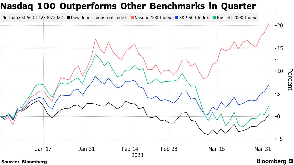 大型科技股推动了纳斯达克100指数今年的强劲增长,帮助这个科技重心指数超过了像标普500和罗素2000这样的更广泛指数。银行业的动荡提振了股市,投资者关注该行业的避险属性:强劲的资产负债表和稳定的收入流。纳斯达克100指数在截至3月31日的三个月内上涨了20%,而标普500上涨了7%,罗素2000上涨了2.3%。纳斯达克100指数在周一稍作停顿,下跌了0.7%。