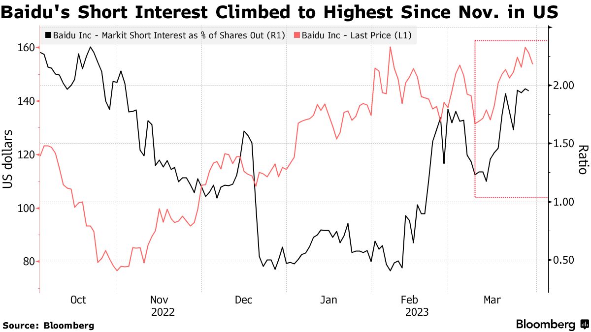 然而,交易员开始增加对短期下行的押注。根据标普全球市场情报的数据,他们已经做空了大约2%的美国存托凭证的自由流通股,这是自去年11月以来的最高水平。在香港,看跌期权的总持仓量接近创纪录。对于所有与人工智能有关的狂热已经过了头,百度不太可能在短期内从中获利,持怀疑态度的人士表示。这是一个类似的担忧,与芯片供应商英伟达公司最近的情况相似。