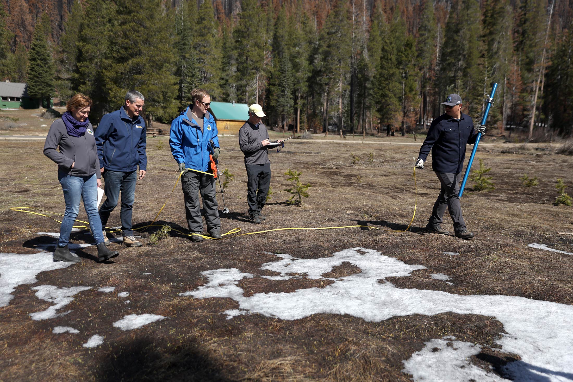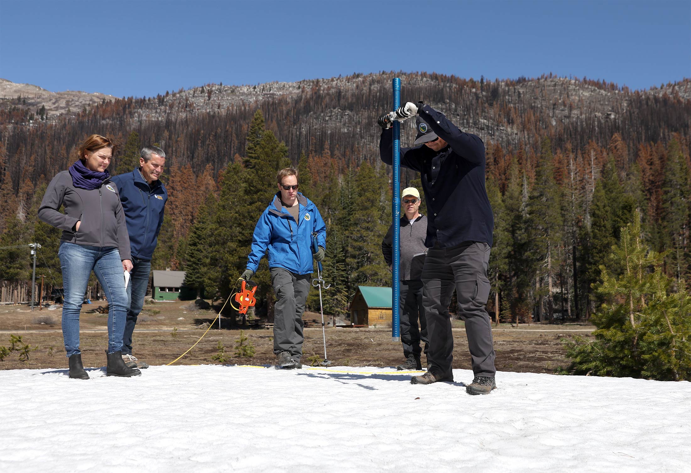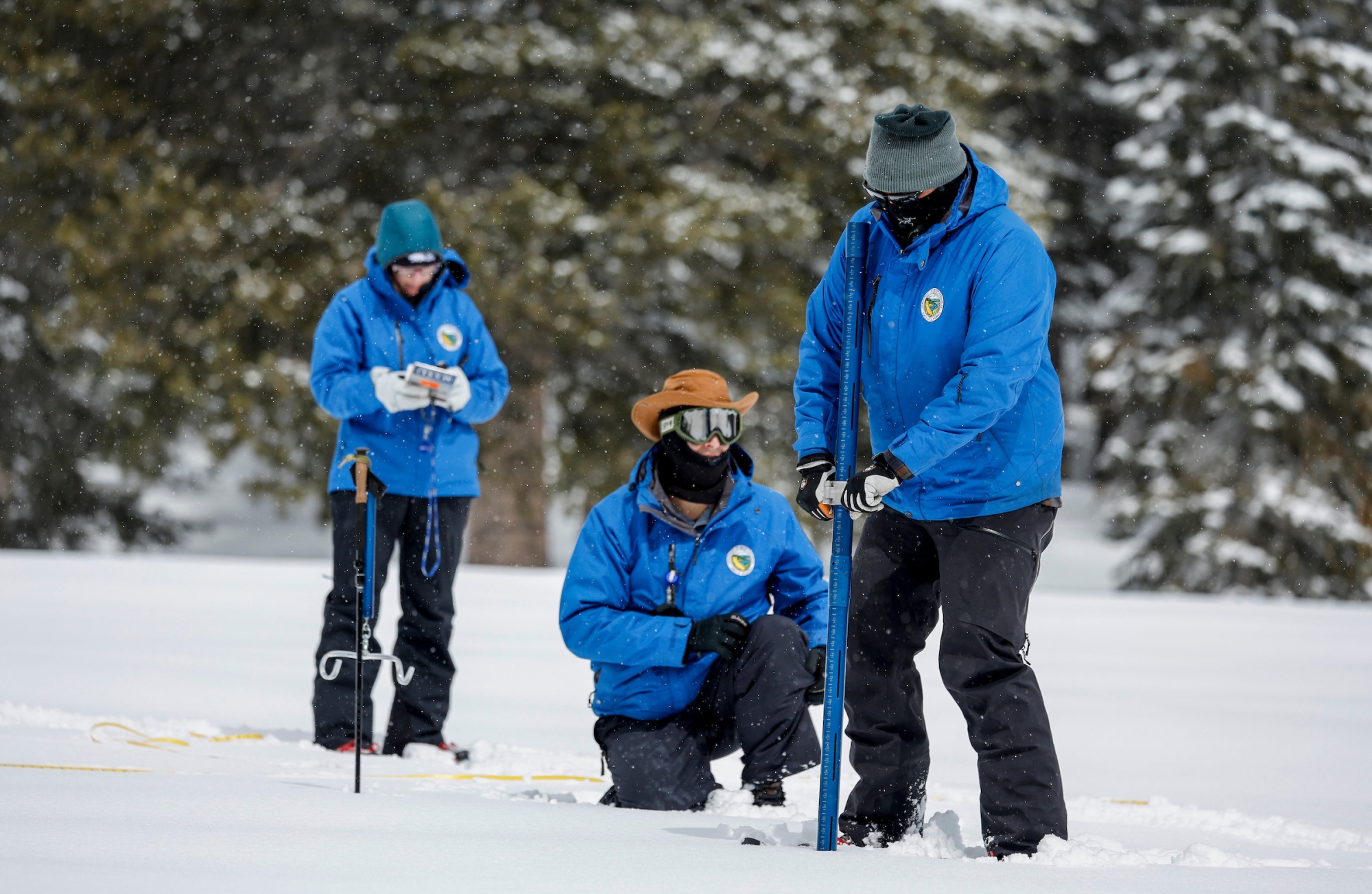 加利福尼亚州水资源部工作人员于2023年4月3日在双桥附近的菲利普斯站进行本季度第四次雪量调查。摄影师:Fred Greaves/加利福尼亚州水资源部阅读更多: 加利福尼亚州毁灭性干旱在大风暴后即将结束
