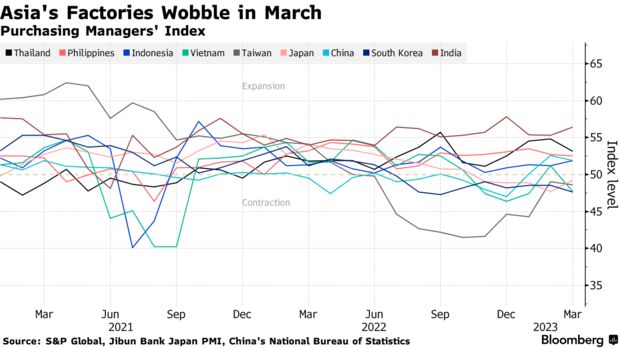 亚洲的放缓 | 三月份,中国的制造业活动意外放缓,一项私人调查显示,随着全球经济前景变暗,亚洲各地的工厂指数下滑。中国财新制造业采购经理人指数——主要覆盖较小规模和出口导向型企业——上个月略微放缓,新订单和产出均下降,达到50的读数,恰好处于扩张和收缩之间的界线。与此同时,韩国的出口下滑延续至三月。
