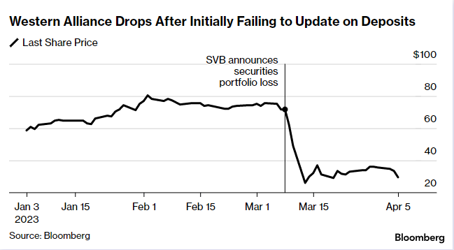 Bloomberg在硅谷银行倒闭后,将资金从一个地区银行转移到另一个地区银行开始有点像打地鼠游戏,Amelia Pollard报道。本周焦点转移到了另一家地区银行Western Alliance Bancorp,这家总部位于凤凰城的银行在周二的财务披露中没有更新股东的存款余额。投资者对此并不满意,周三股价一度暴跌超过19%,后来在宣布存款减少幅度低于一些分析师估计后有所回升。