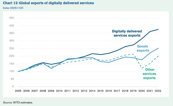 跨境数字贸易流量的增长 — 如电子商务、视频流媒体、游戏和应用程序 — 自2005年以来增长了四倍,目前价值约为3.8万亿美元,根据世界贸易组织的一份新报告。这占据了全球所有服务贸易的一半以上。