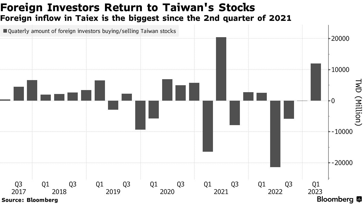 美中紧张局势升级和全球经济放缓的担忧导致外国投资者去年从台湾股市撤资,这是自2019年以来的首次净流出。这一趋势已经逆转,台湾证券交易所第一季度录得120亿新台币的资金流入,是除中国外亚洲最多的。