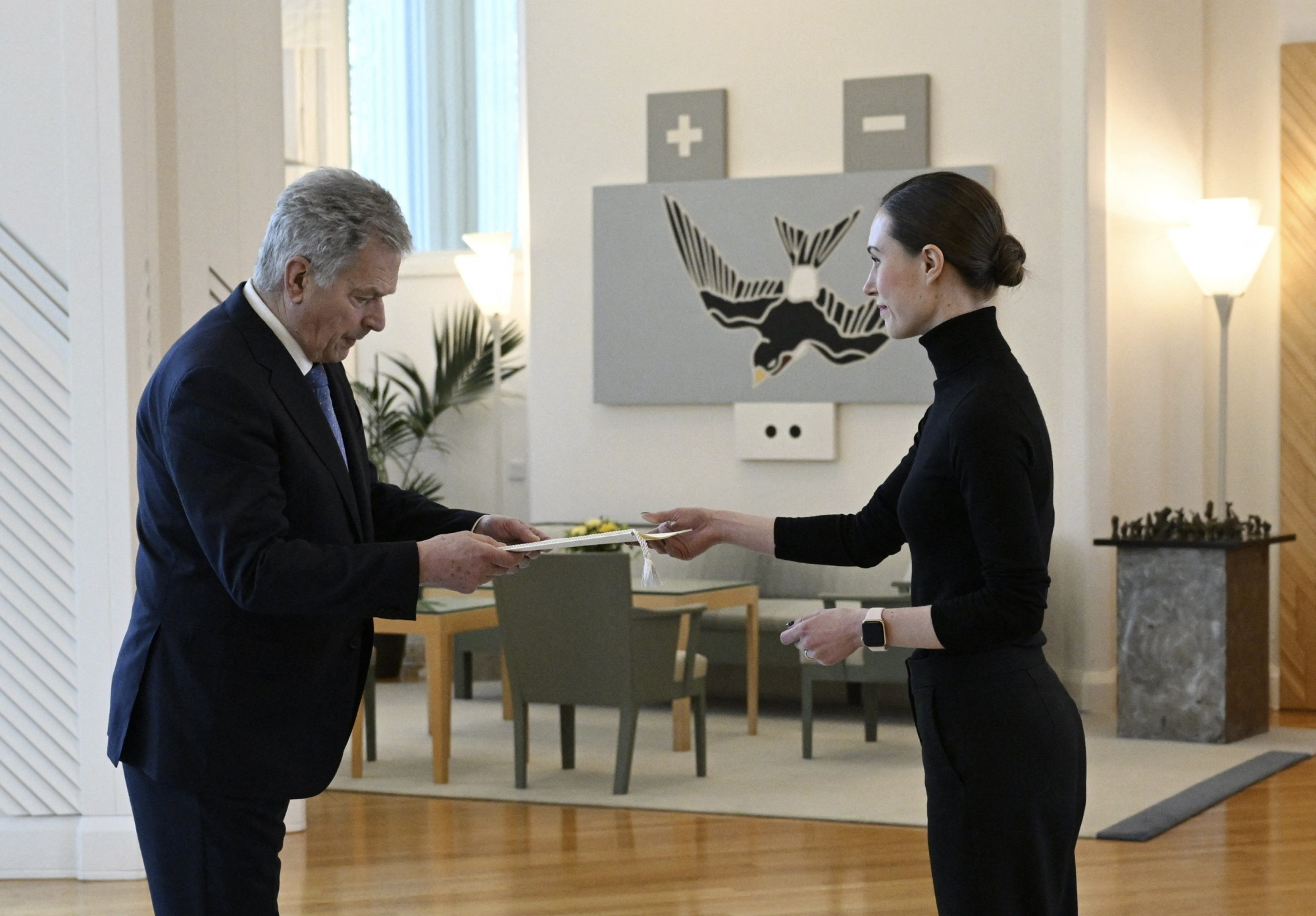 桑娜·马林于4月6日向总统索利·尼尼斯托递交了辞职信。摄影师:马尔库·乌兰德/盖蒂图片社