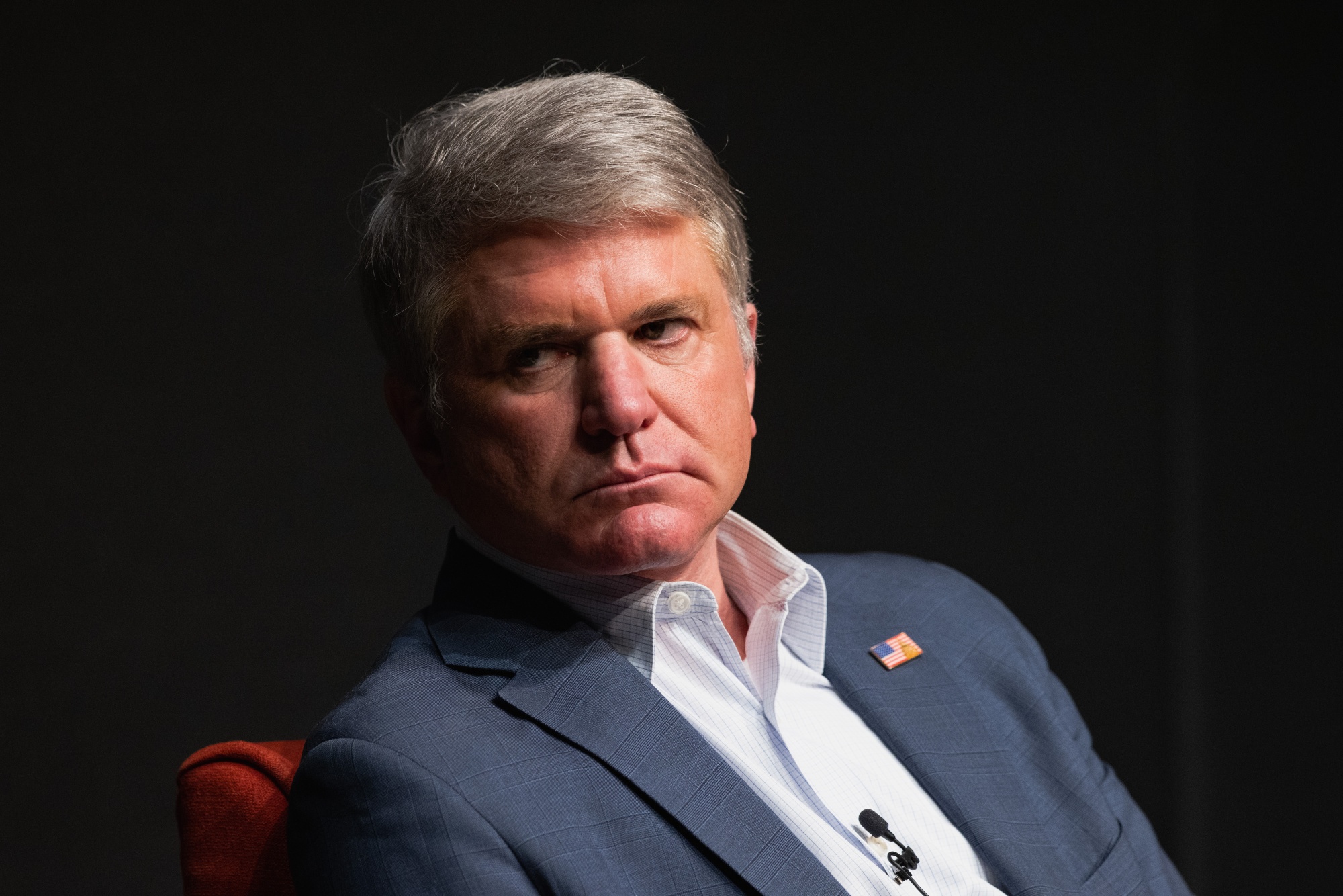 摄影师:乔丹·冯德哈尔/彭博社美国众议员 迈克尔·麦考尔 在台湾副总统身旁将中国领导人习近平比作阿道夫·希特勒,后者计划在明年一月的选举中竞选执政党。