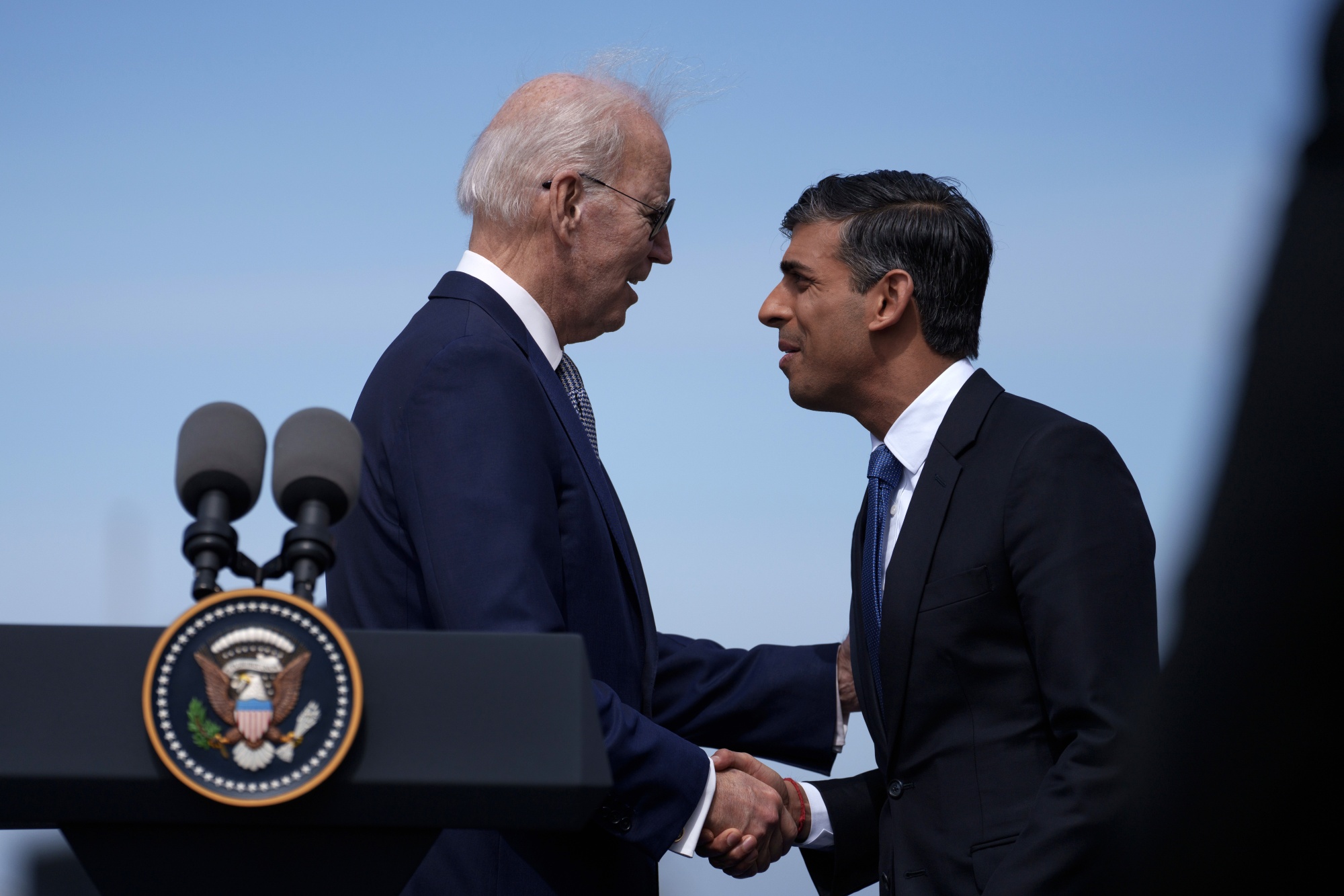 美国总统乔·拜登和英国首相里什·苏纳克。摄影师:埃里克·泰耶/彭博社据知情人士称,英国官员现已拟定了一项多阶段路线图。第一步将是正式协议,涵盖在与特朗普政府的谈判中基本达成的领域,如加强中小企业的机会。