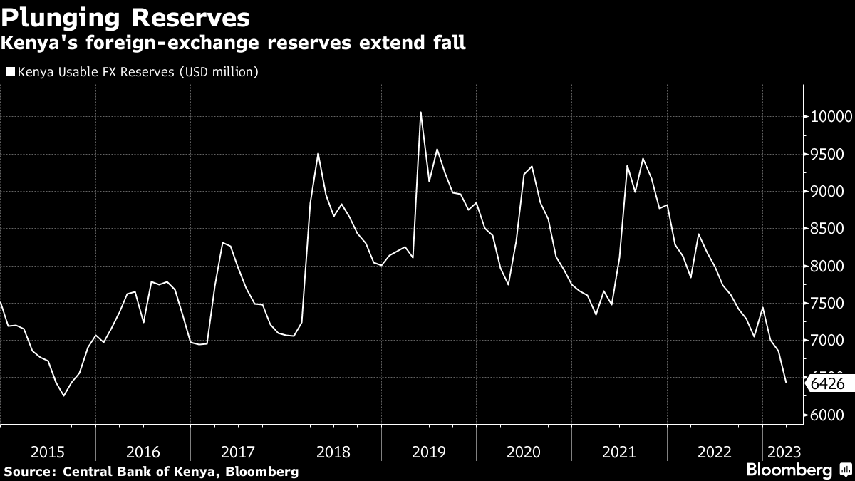 肯尼亚的外汇储备 在三月份的三个月内暴跌了约14%,降至64.3亿美元。这是至少13年来最大的季度性下降,因为进口成本的上升使中央银行的美元储备流失。