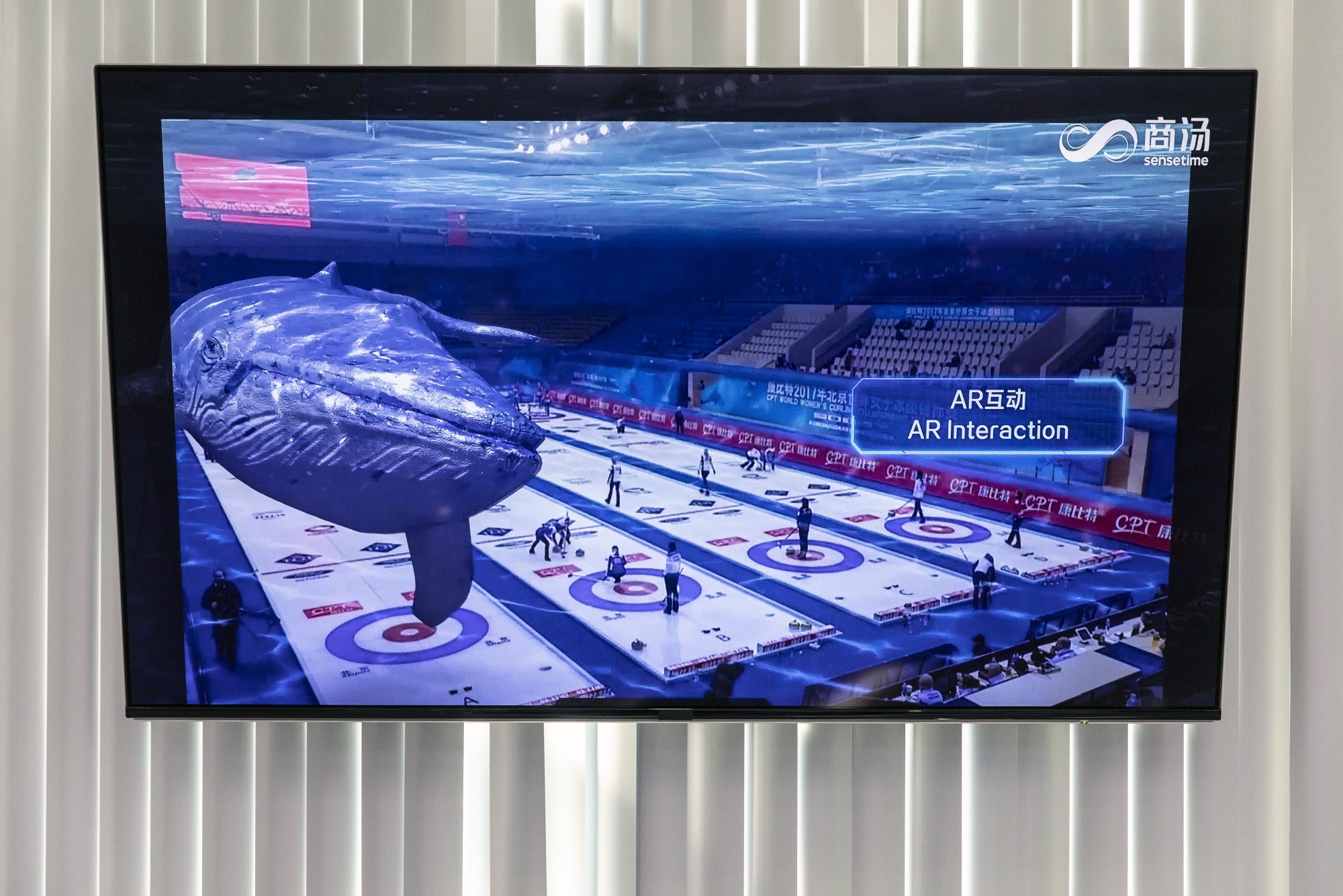 一块屏幕显示了上海商汤科技集团总部的增强现实应用。