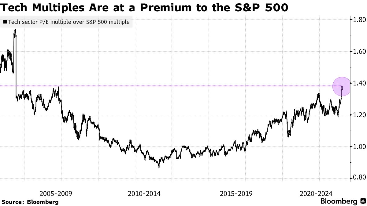 苹果的交易价格是预计收益的26倍,高于其10年平均值18倍。微软也高于其长期平均水平,两者都高于纳斯达克100指数的24倍,而纳斯达克100指数本身也高于其长期平均水平。标普500信息技术指数的前瞻性收益倍数相对于整体基准最近达到了自2005年以来的最高水平。