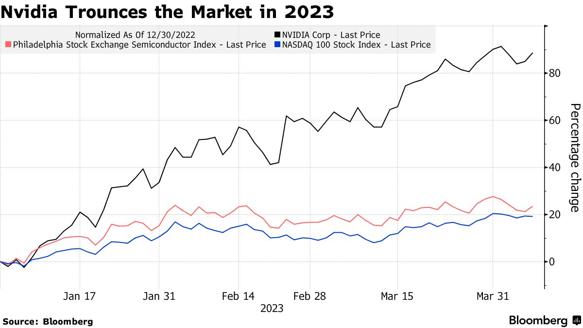 英伟达在2023年表现突出,涨幅达到88%,是纳斯达克100指数中表现最好的组成部分。这一涨幅轻松超过了指数本身的19%涨幅,以及费城证券交易所半导体指数的24%涨幅。英伟达的大部分涨幅与人工智能技术的兴趣有关。相关。