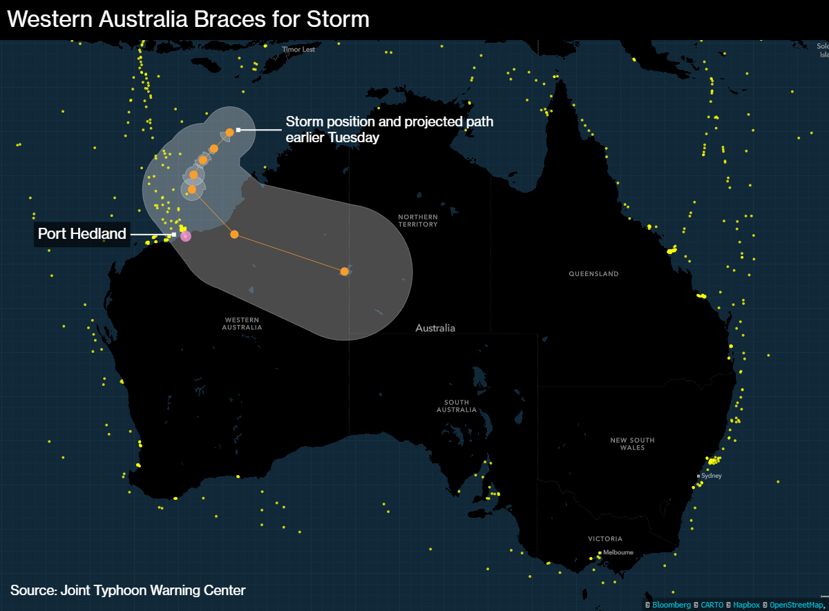 34节风速预测半径为白色,较小的多边形表示50节风速预测区域。最新散货和矿石船位置为黄色(截至4月11日)Fortescue正在为台风做准备,并已暂停所有非必要前往其Pilbara运营地点的旅行,据一位发言人称。他们表示,在这个阶段不会有重大影响。