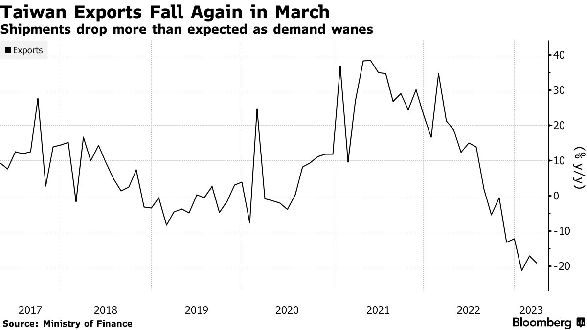 台湾的出口在3月份下降幅度超出预期,因为全球对电子产品的需求仍然疲弱,这表明对于依赖贸易的经济体来说,最糟糕的情况还没有结束。