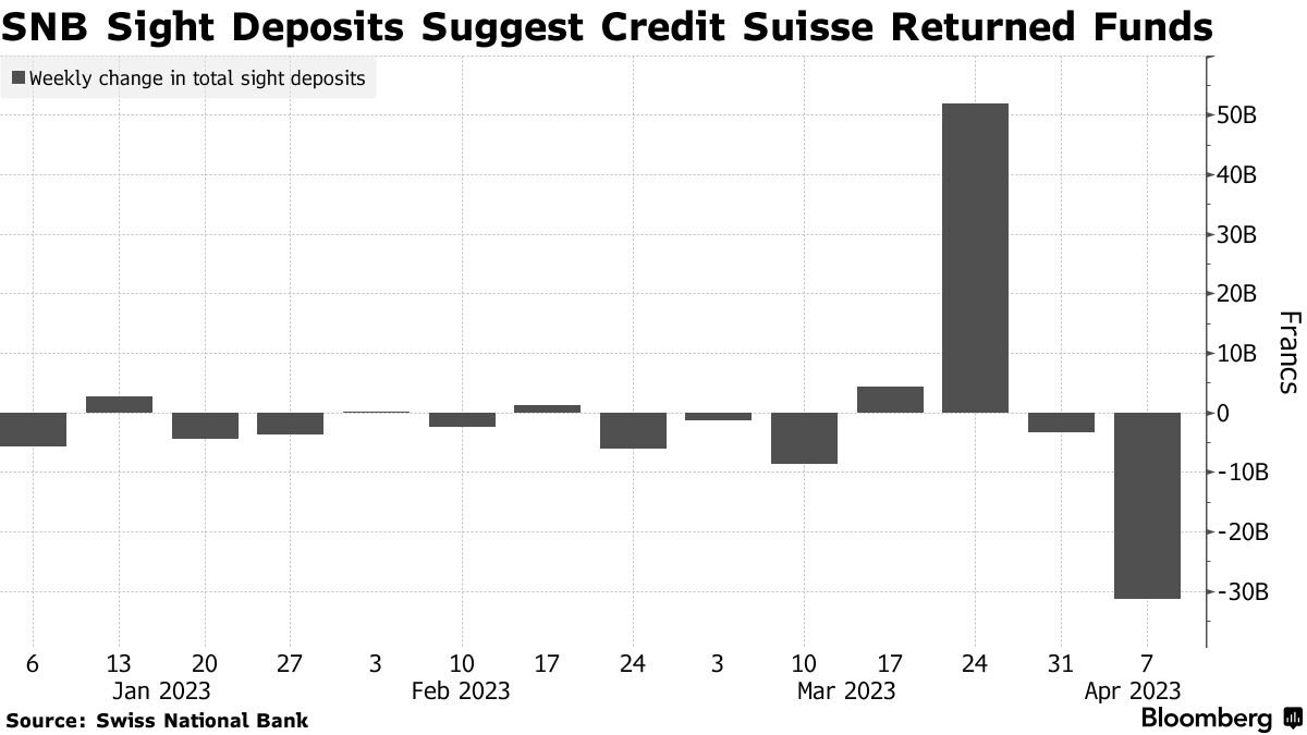 除了国家担保外,瑞士国家银行提供了流动性援助。本周公布的SNB即期存款数据表明,瑞士信贷可能已经归还了超过一半的资金。