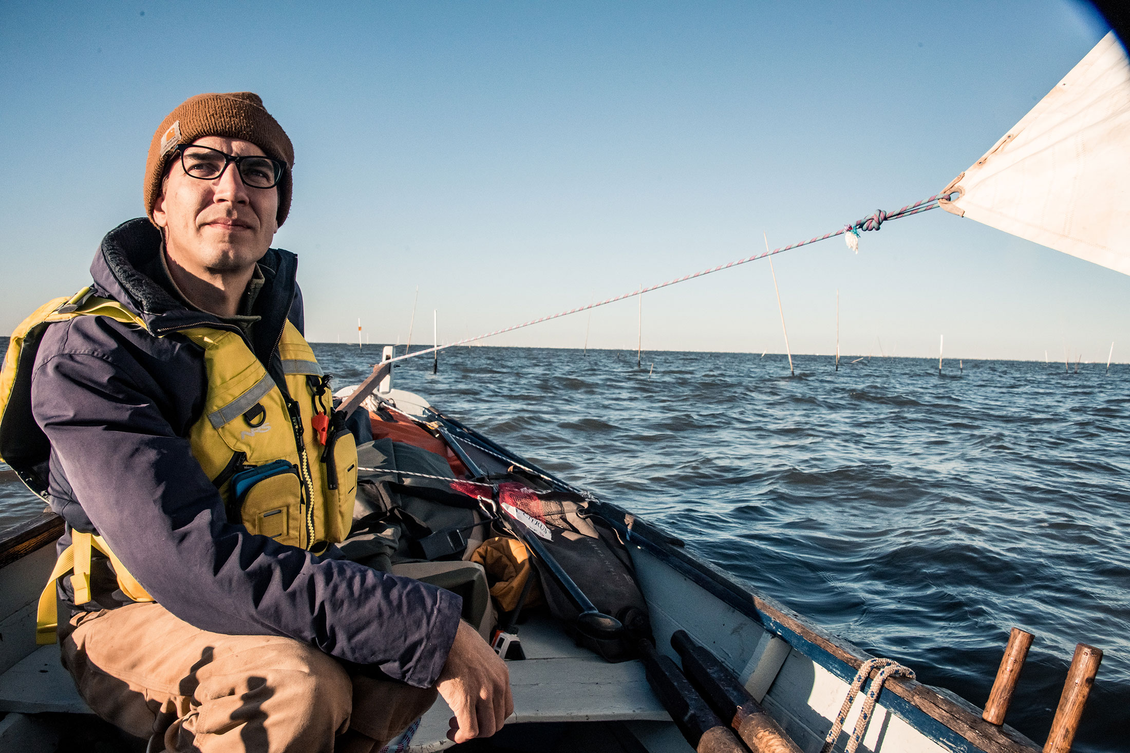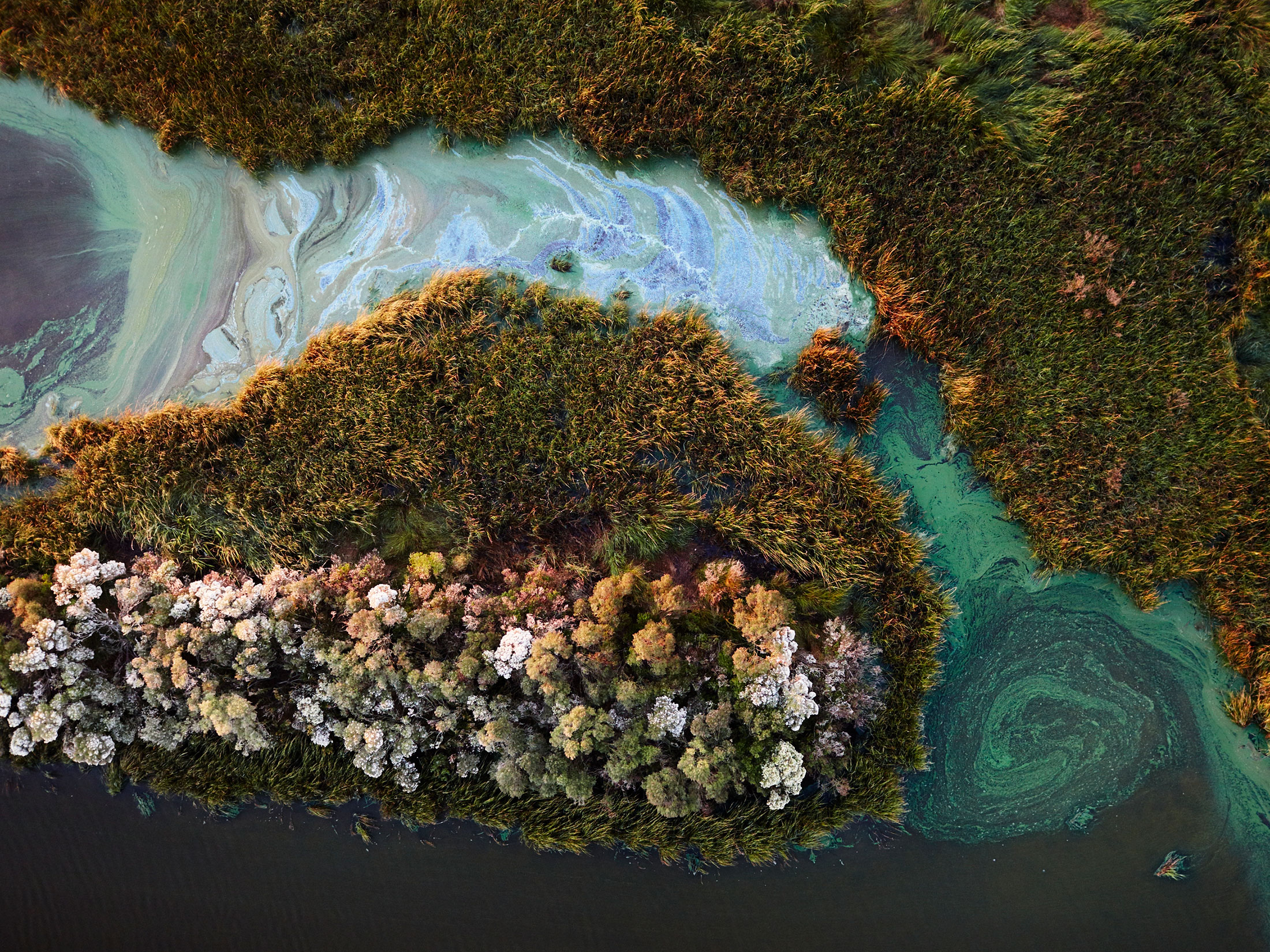 2016年拍摄于路易斯安那州蒙特古特附近湿地的蓝细菌藻类。摄影师:本·德普在空中拍摄时,多米尼克发现很容易集中精力在自己的工作上,尽管没有时间去更换相机镜头。偶尔,当他停下来看看下方的渔民有多么渺小时,他才会完全意识到自己的高度。(他的滑翔伞指导也觉得很有趣地进行危险的下降。)
