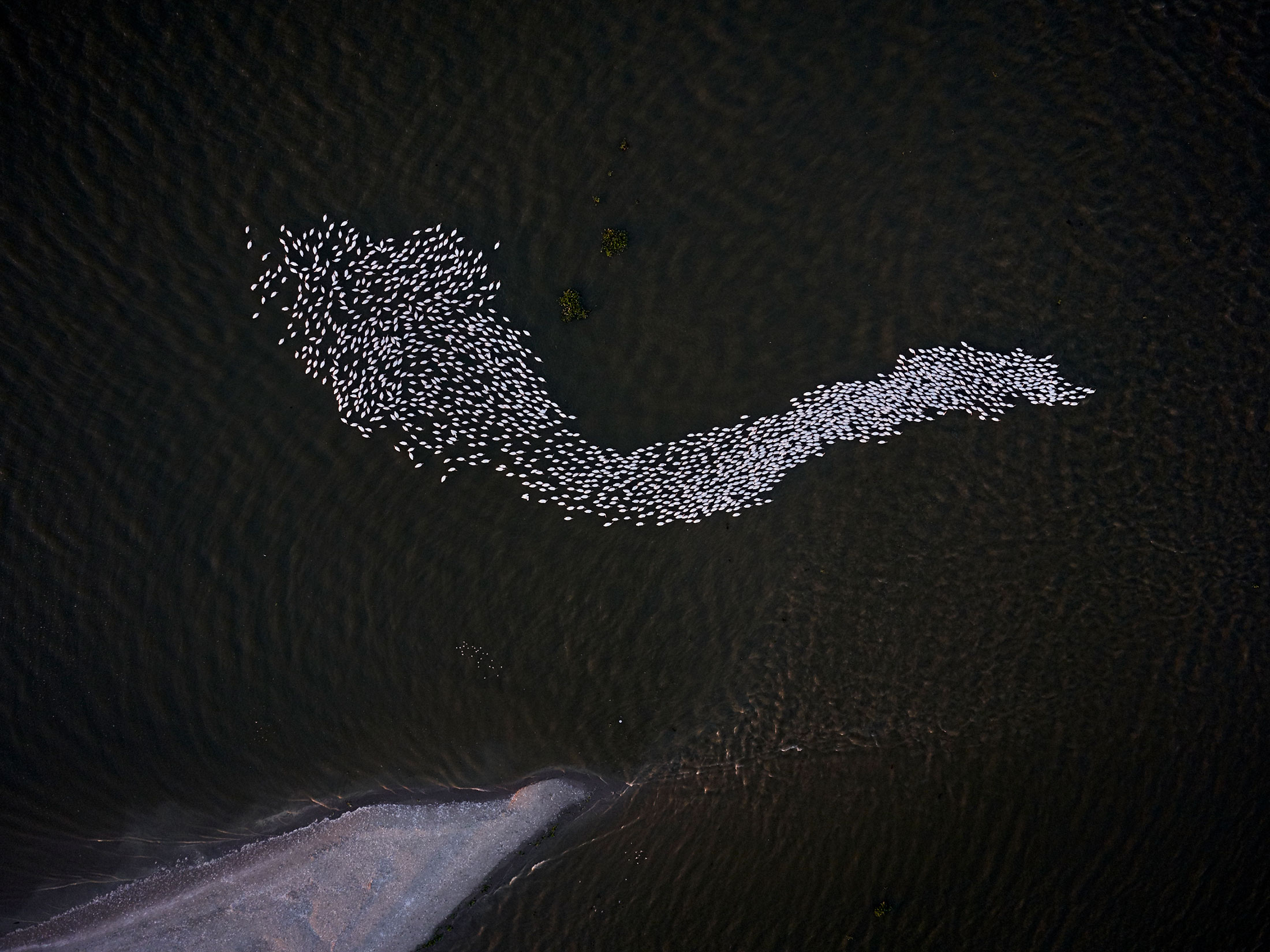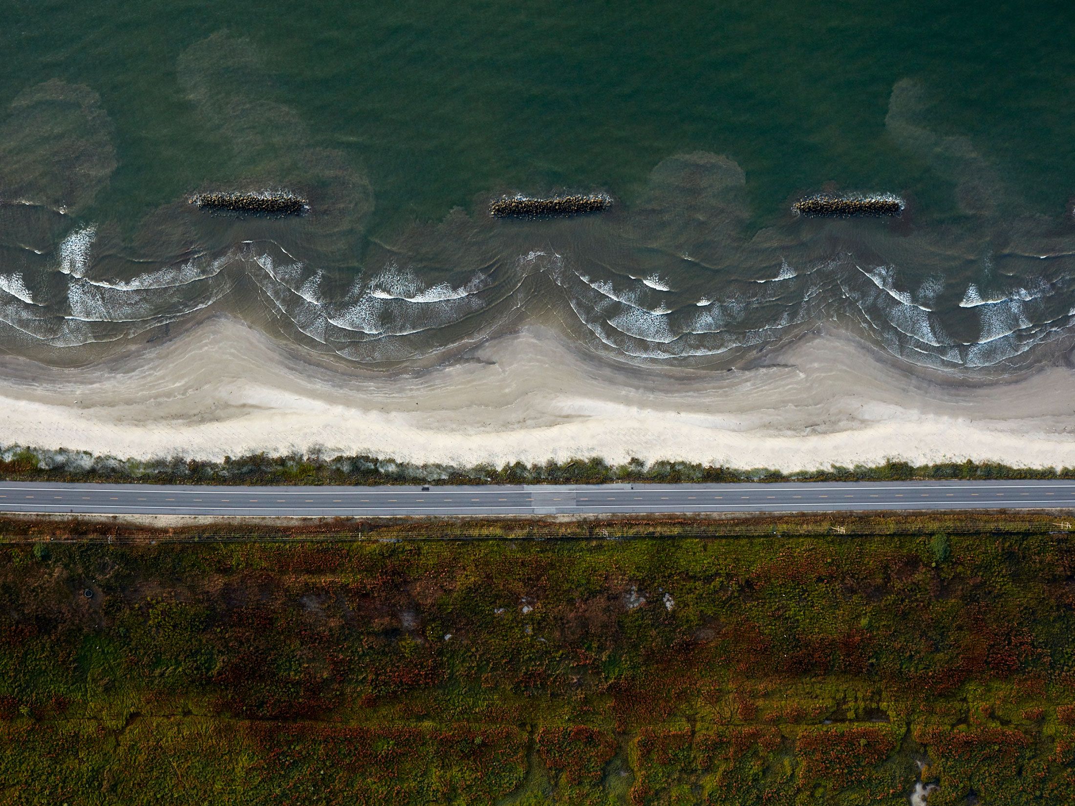 2018年的一张照片,显示了一群白鹈鹕停留在斯科菲尔德岛的边缘,该岛在五年前重建。摄影师:本·德普这些严重影响大部分都很难看到。平坦的土地和高高的防洪堤几乎让居民无法步行评估损害。因此,德普的视角是独特的,反映了只有直升机才能到达的高度,比卫星或飞机更详细。只有在低空飞行时,他才能捕捉到一团蓝绿色的藻类绕着一堆地黄草旋转的景象。从空中5000英尺处,他捕捉到了波浪与岩石断裂处相遇的锯齿状牙齿,以及一群云形状的候鸟。德普还近距离看到了环境影响:迷宫般的运河、废弃的井口、散落的垃圾。